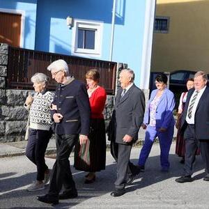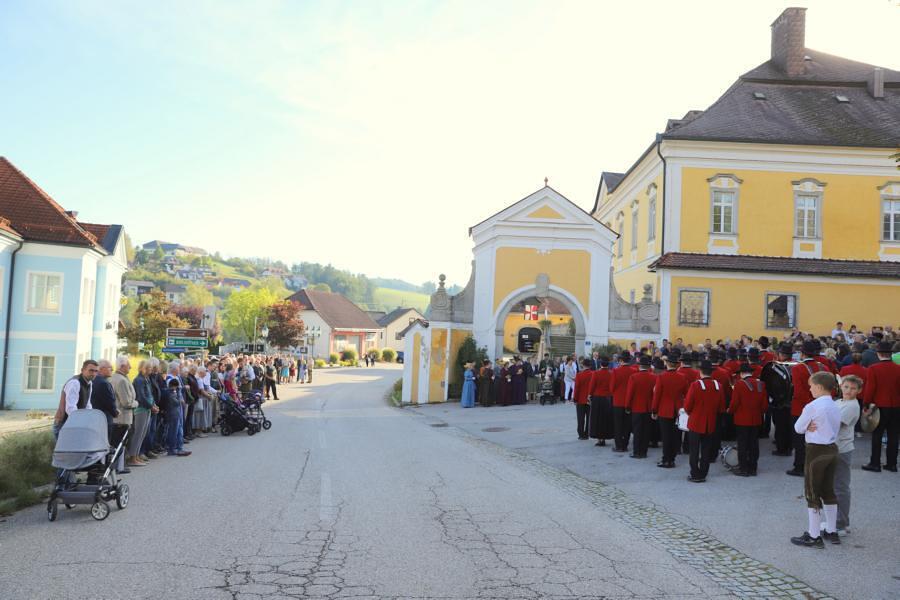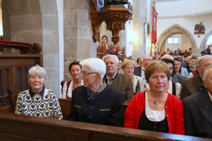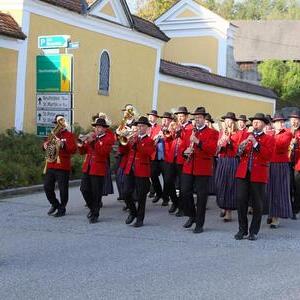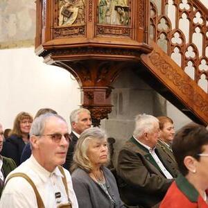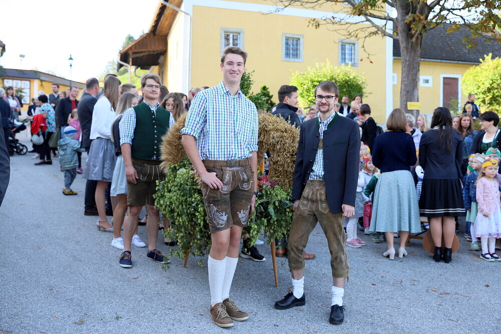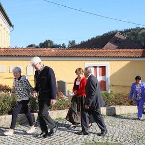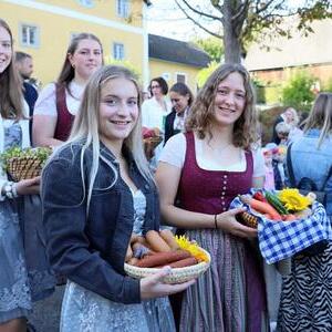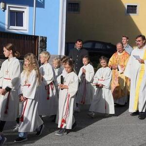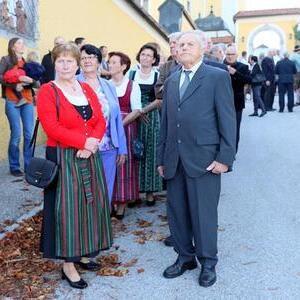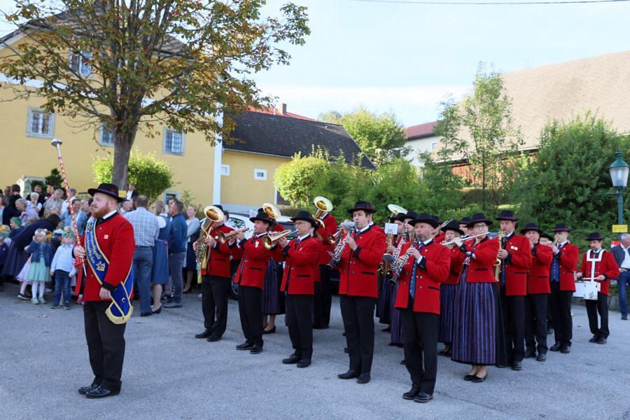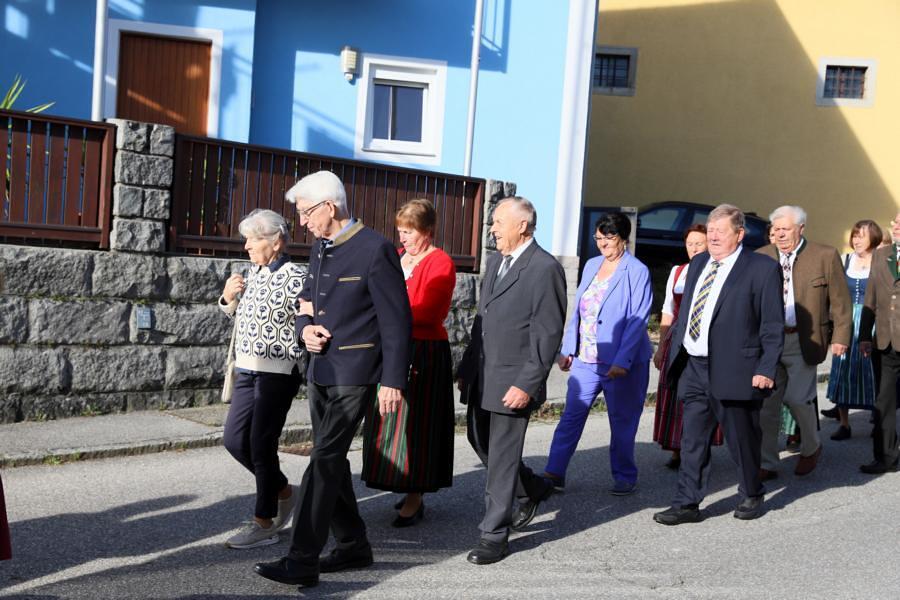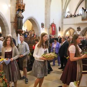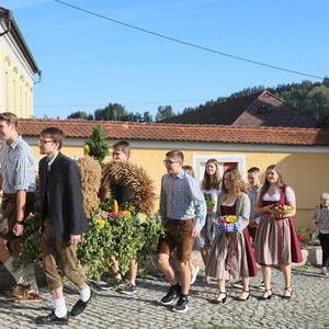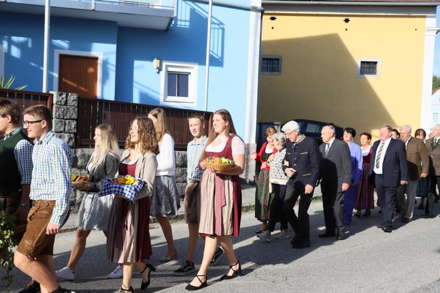 Helmut Außerwöger und Kurat Karl Arbeithuber leiteten die Feier am Kirchenplatz und zogen anschließend mit den Ehejubilaren, die wie jedes Jahr zu Erntedank gefeiert werden, mit den Ministranten, den Kindergartenkindern und ihren Betreuerinnen, der Landjugend mit den Erntegaben und der Erntekrone, sowie Musikkapelle und Goldhaubenfrauen in die Kirche, wo der festliche Gottesdienst , musikalisch vom Chor Klangvoll gestaltet, gefeiert wurde.