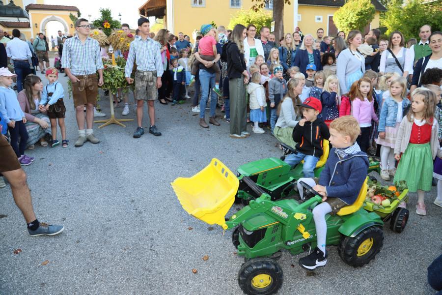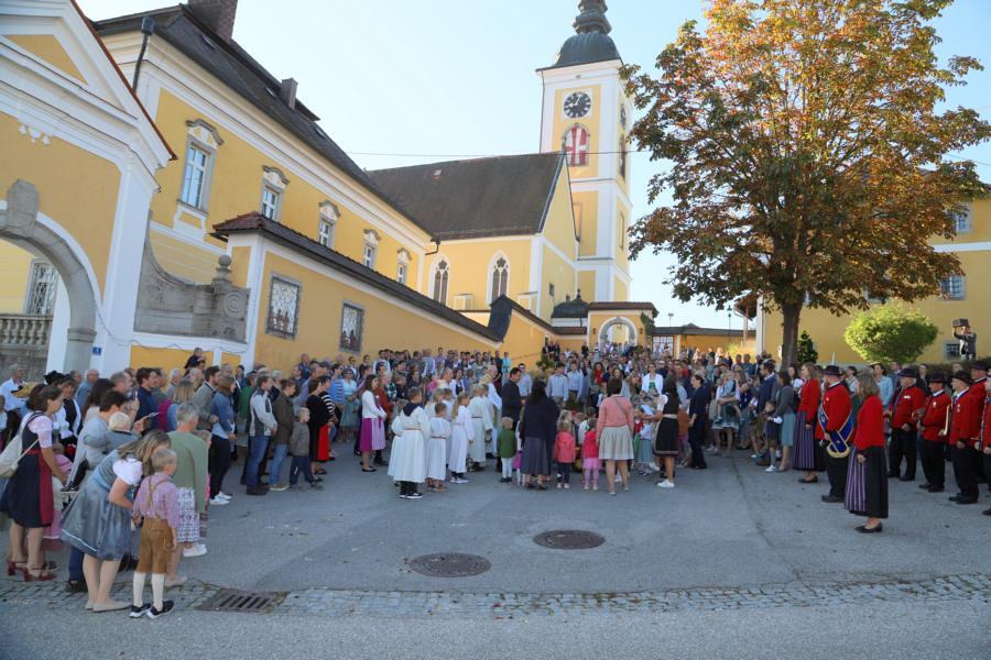 Nach der Segnung der Erntekrone durch Prälat Johann Holzinger und Kurat Karl Arbeithuber, zog die Feiergemeinde unter den Klängen der Musikkapelle, begleitet von den Ministranten, der Goldhaubengruppe, den Kindergartenkindern (dabei waren auch 2 Kinder mit Trettraktoren und Erntegaben im Anhänger) und der feiernden Bevölkerung, in die Kirche ein. Die Kinder blieben im Pfarrhof, wo sie im Rahmen der Kinderkirche die Erntekrone genau betrachten konnten und auch eine Erntedankfeier abhielten. Währenddessen wurde in der Kirche der Dankgottesdienst – sehr schön gestaltet vom Chor „Klangvoll“ - zelebriert. Zum Opfergang wurde die Erntekrone und Erntegaben feierlich von den Jugendlichen der Fachgruppe, begleitet von den Kindern und deren Eltern, in die Kirche gebracht.