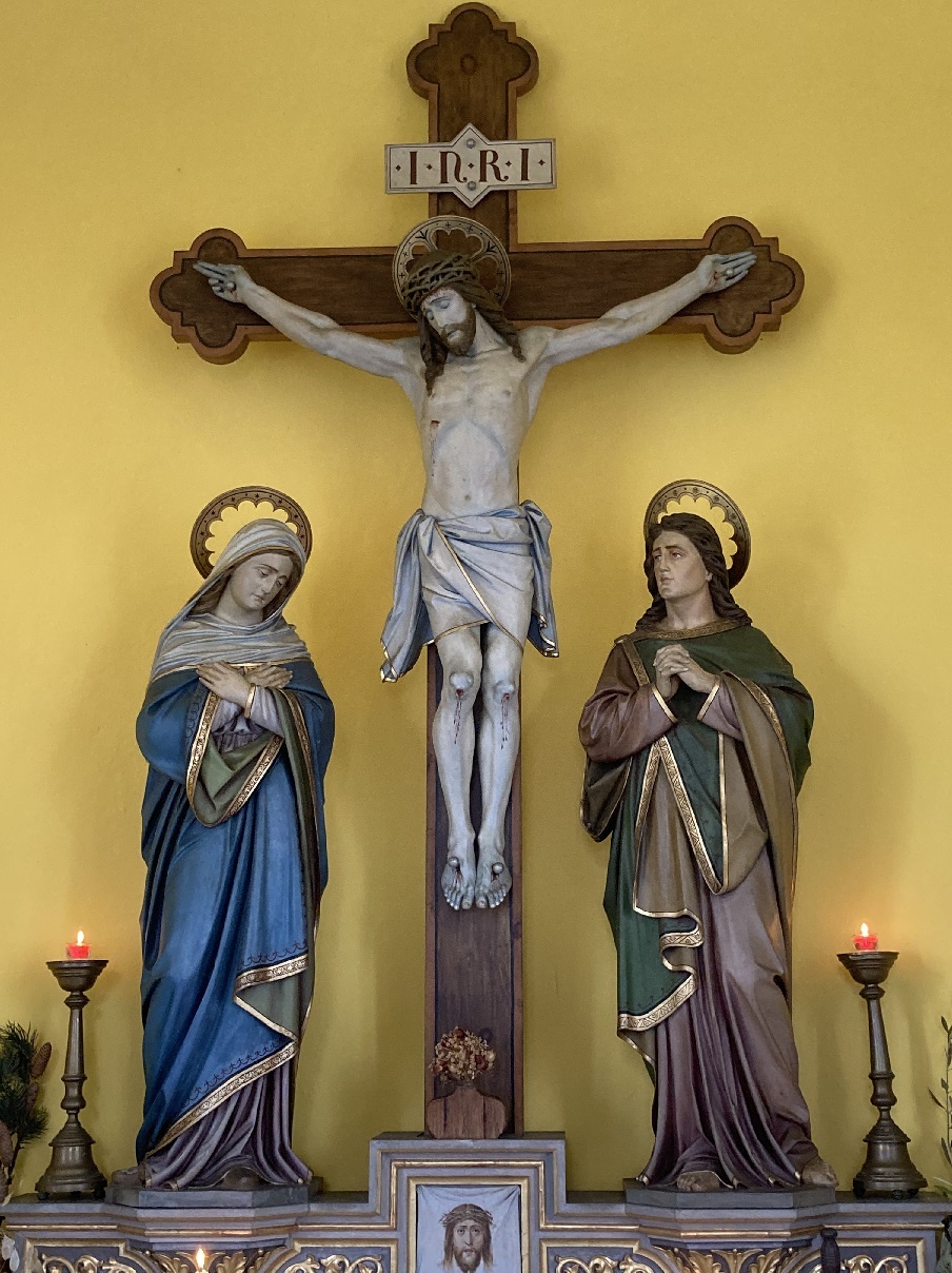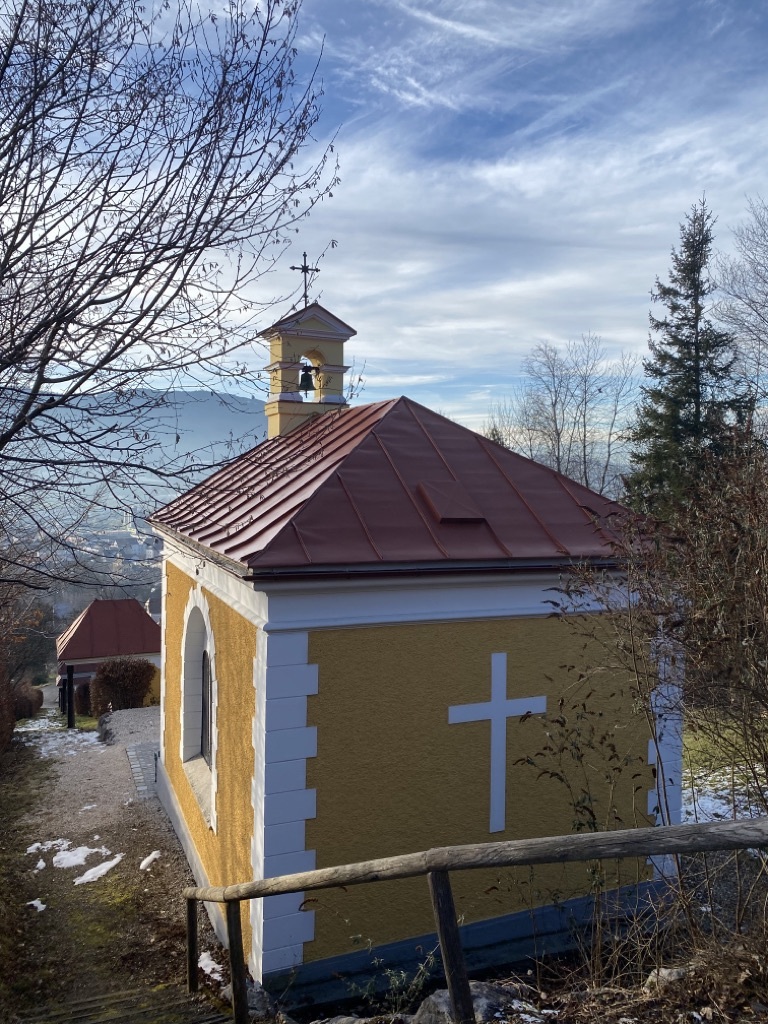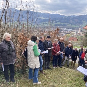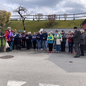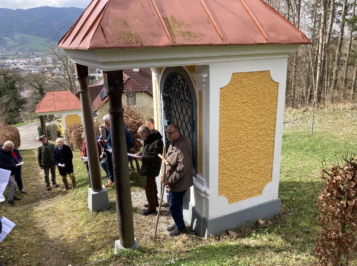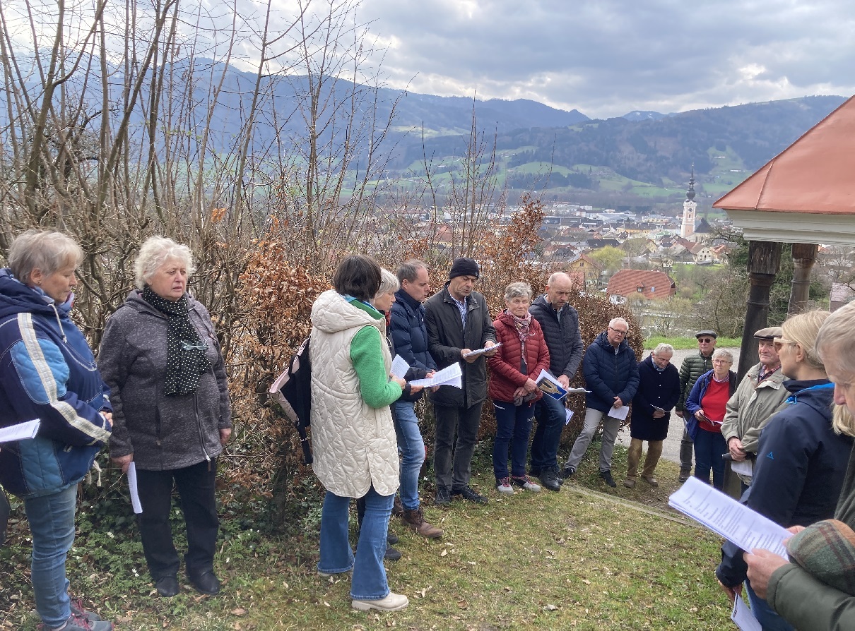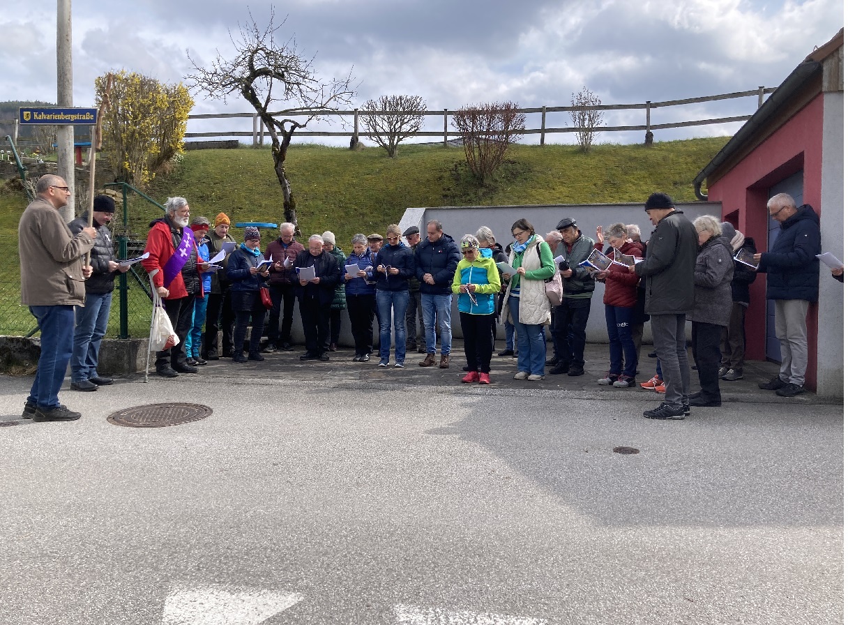 Von der Pfarrkirche Kirchdorf aus wurden –– zuerst die Kalvarienbergstraße entlang und dann den Kapellenweg hoch gegangen. Die gebeteten Texte in den 14 Stationen versuchten den Leidensweg Christi mit dem Heute zu verbinden. Das Chorquartett aus der Pfarre Kirchdorf begleitete die Gruppe mit stimmigen Lieder.