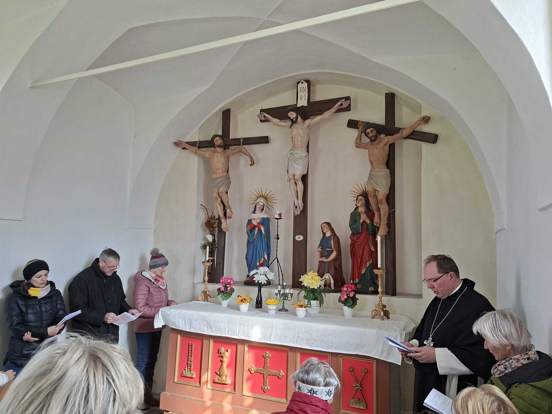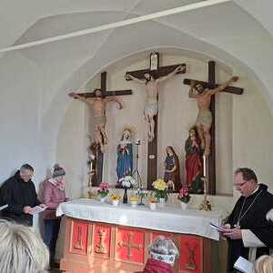 - Die gebeteten Texte in den 14 Stationen versuchten den Leidensweg Christi zu vergegenwärtigen und mit dem Heute der TeilnehmerInnen zu verbinden. In der Kapelle dann - nach den Stationen - die Hinwendung zur erlösenden Auferstehung Christi.