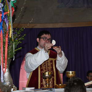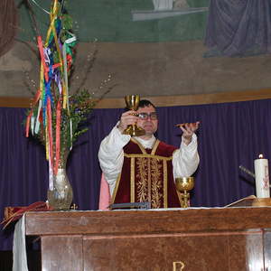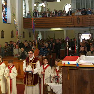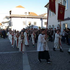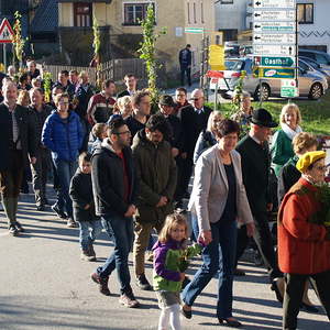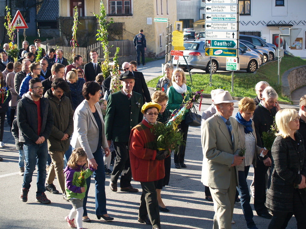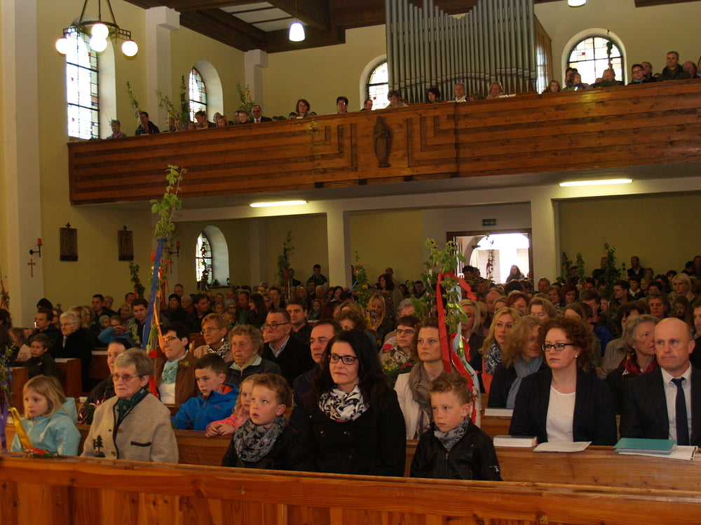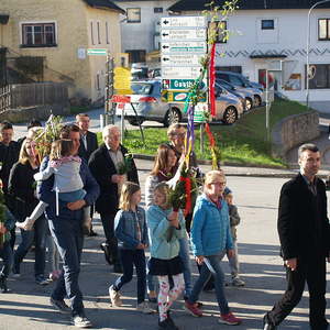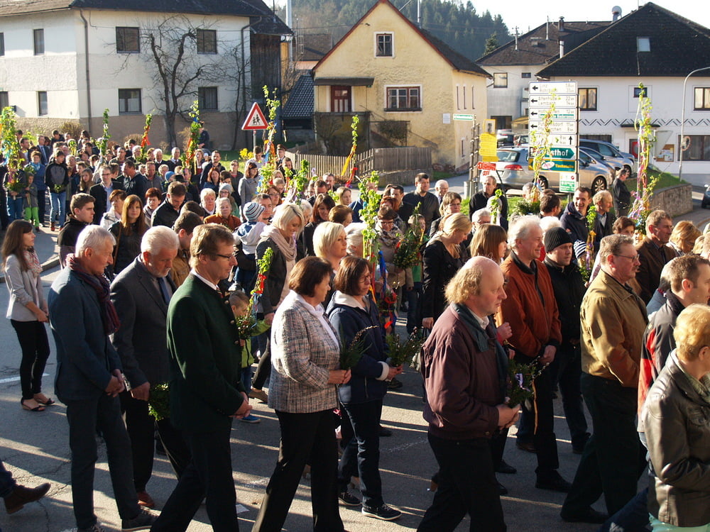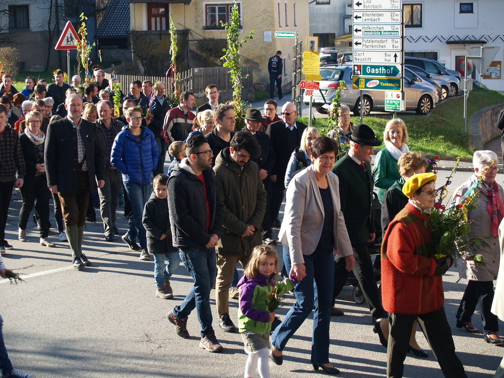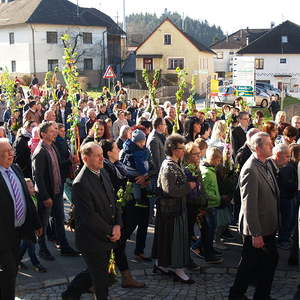 Die Musikkapelle, der Kirchenchor, die Ministrantenschar und die Pfarrgemeinde versammelte sich außerhalb der Kirche am Gemeindevorplatz. Viele Gläubige trugen Zweige in den Händen, viele Jugendliche trugen meterhohe gebundene Palmbuschen zur Kirche. Auch für Pfarrer Maximilian wurde ein eigener Palmbuschen angefertigt.