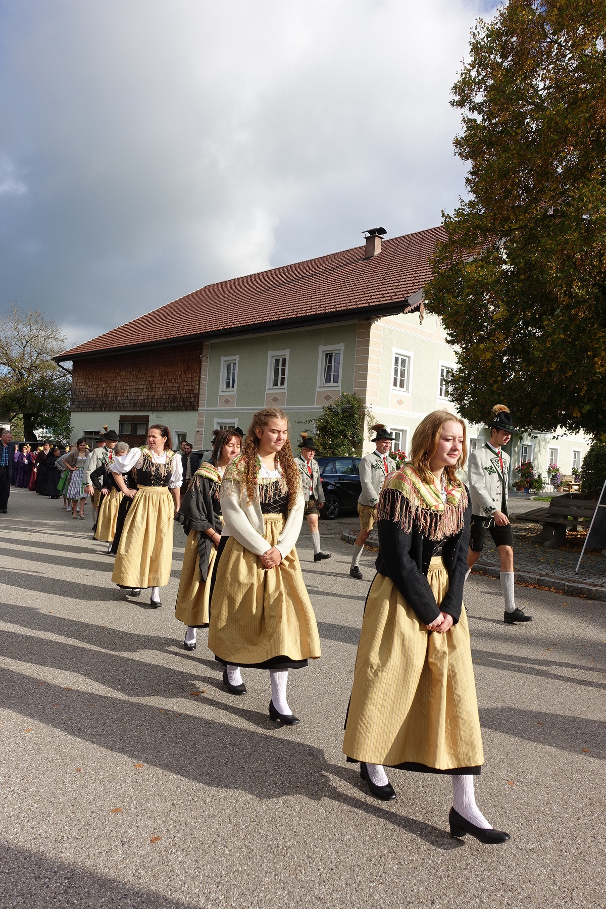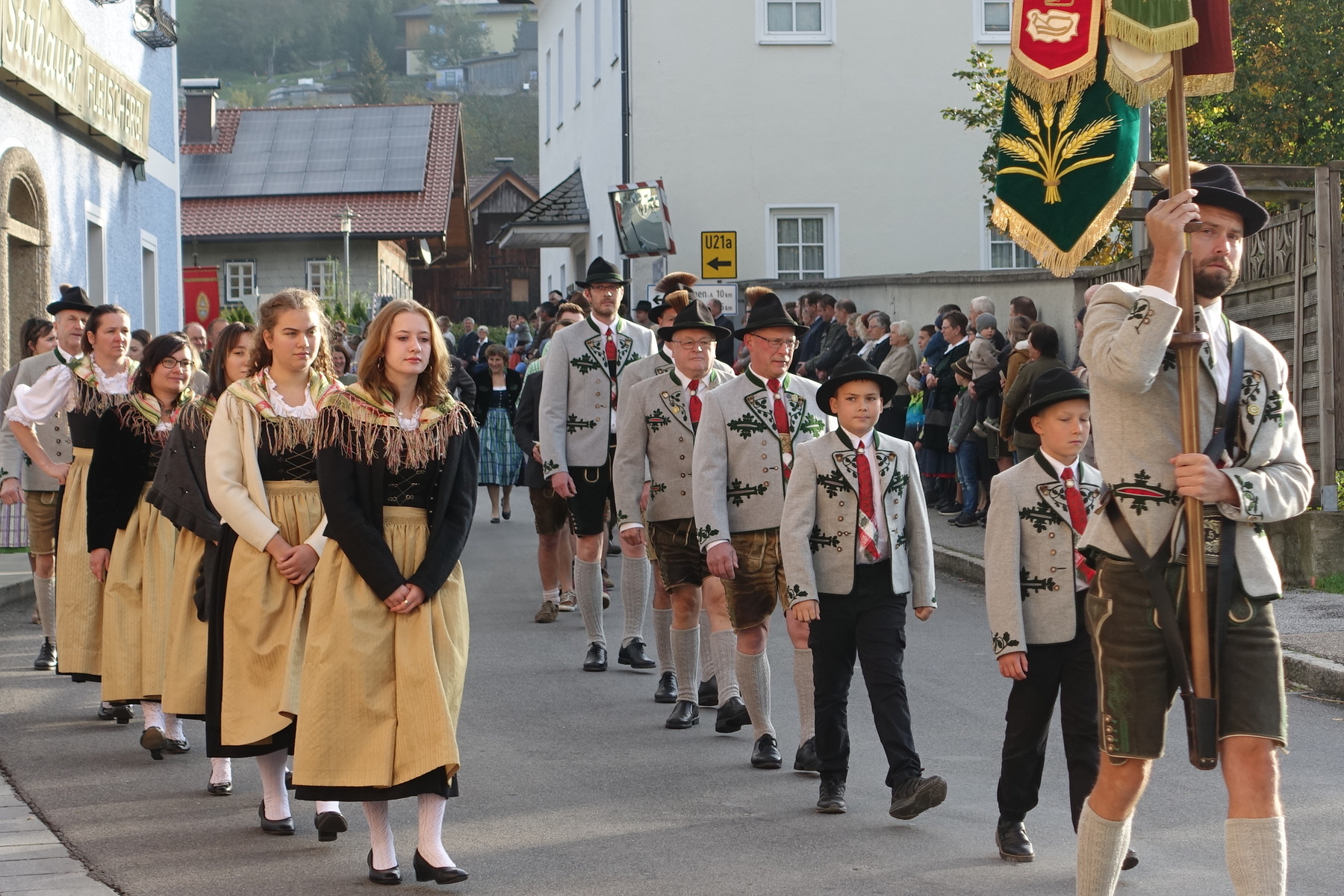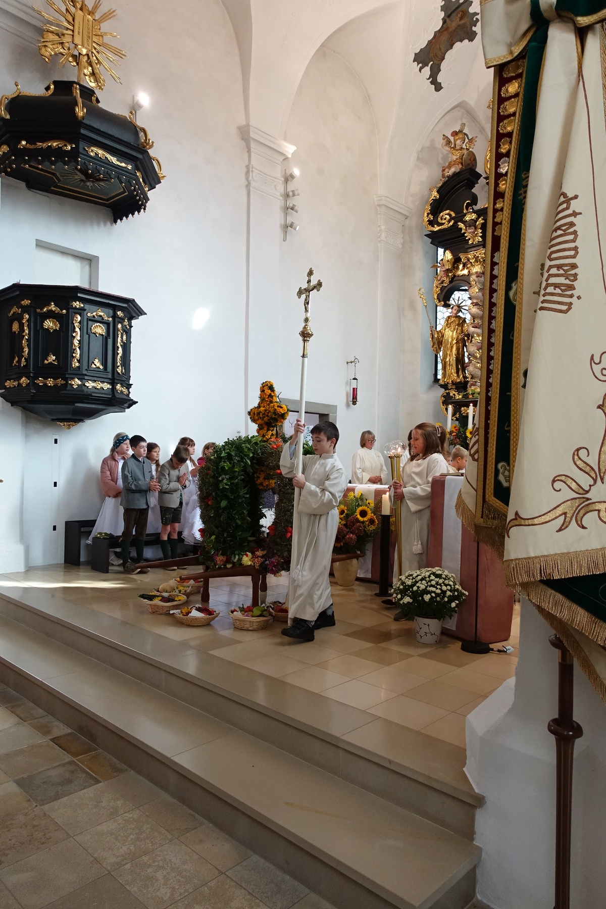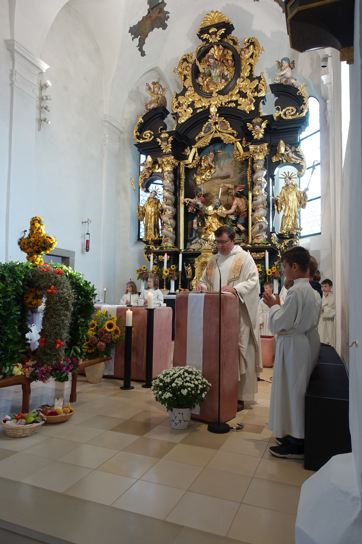 Um 08:30 Uhr fand vor dem Pfarrhof die Segnung der Erntekrone statt. Anschließend zog der Festzug mit den örtlichen Vereinen, den Erstkommunionkinder und dem Kindergarten zum Gottesdienst in die Pfarrkirche ein. Im Anschluss luden die Bäuerinnen im Vereinsheim zu einer Agape ein.