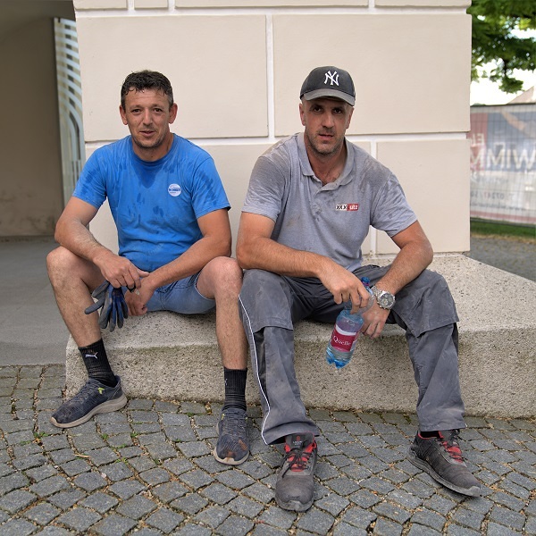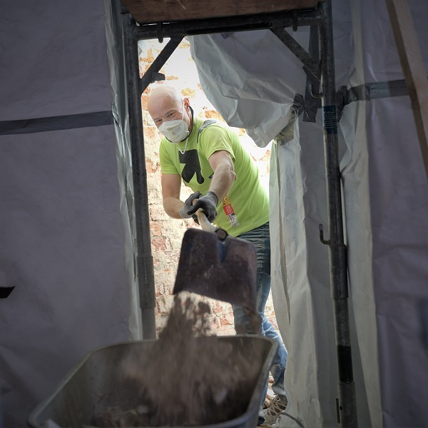 Ich bin mir nicht sicher. Miroslav dürfte über 2 Meter groß sein, Vito Ivancevic vielleicht knapp drunter. Größe KANN bei Kirchenbaustellen von Vorteil sein. Alles ist riesengroß und hoch. Wer groß ist, reicht weiter hinauf, überbrückt mit seinen Armen größere Zwischenräume. Die Betonung liegt aber auf dem Wörtchen „kann“. Denn heute haben die Stemmarbeiten im Osten der Kirche begonnen. Eingeengt zwischen der Rundung der Apsis und dem Hochaltar, bleibt nicht viel Freiraum. Da kann es von Vorteil sein, kleiner und wendig zu sein wie Jürgen Lindlbauer. Ob groß oder klein, die Kraft ist jedenfalls keinem von den Dreien ausgegangen. Egal, ob beim Putz-Herunterstemmen oder beim Schutt-Schaufeln. Jürgen, Vito und Miroslav haben die Apsis besenrein übergeben.
