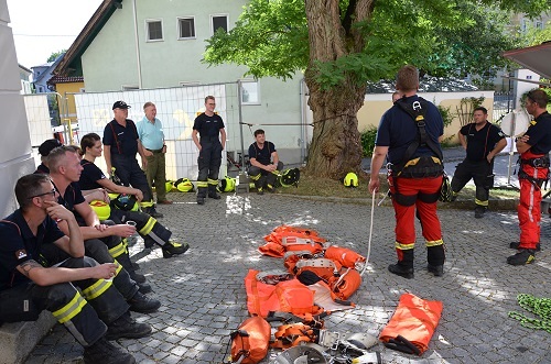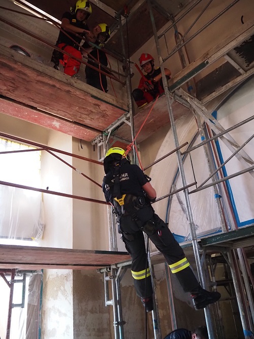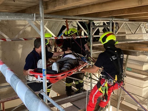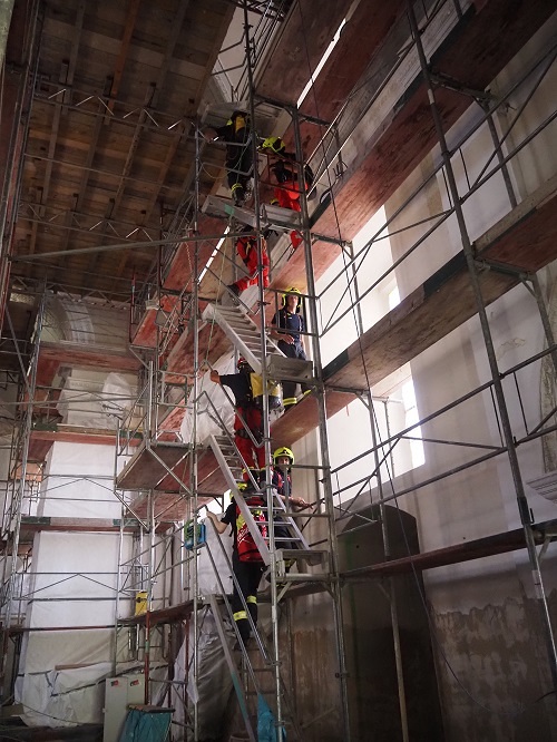 Das Gerüst und der Tanzboden in unserer Kirche hat für diese Übung die optimalen Voraussetzungen geboten. Pfr. Franz hat sich bereit erklärt, eines der Übungsopfer zu spielen. Den Tanzboden erklomm Pfr. Franz gemütlich zu Fuß, nach unten wurde er ganz professionell mit der Rettungstrage abgeseilt. Mit Spannung wurde die Rettung beobachtet und mit Bildern festgehalten.