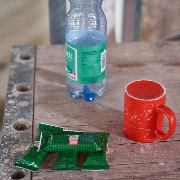 Dass heute Morgen die Kirchenbaustelle still und verlassen da liegt, hat nichts mit dem blauen Montag zu tun. Die Mitarbeitenden der Firma Tinzl haben zum Teil lange Anfahrtswege zu bewältigen. UND sie dürfen sich die Dienstzeiten frei einteilen. Es gilt, das Arbeitspensum bis zum vereinbarten Schlusstermin zu bewältigen. Und darauf können wir uns verlassen. Wenn nötig, mit ihrem Arbeiten bis tief in die Nacht hinein. Pinsel, Handschuhe und Müsli-Riegel verkünden: Wir sind gleich wieder da!