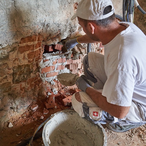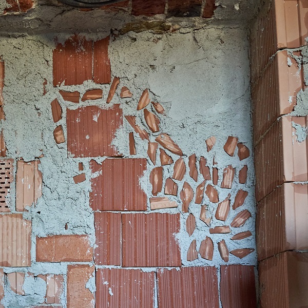 Bis jetzt hat sie sich ja schamhaft versteckt, die Rückwand des Schaltkastens. Hinter einer großen Platte. Aber es hat ihr nichts genutzt. Im Zuge der Erneuerung der Elektroinstallation musste sie sich zeigen mit all ihren Löchern, Hohlräumen und einem bröckelnden Putz. Drum haben die Mitarbeiter der Firma Mitterhauser Puzzle bauen müssen, um eine stabile und plane Rückwand zu formen. Das Ziegel-Mosaik ist fast zu schön, um hinter dem Verputz zu verschwinden.