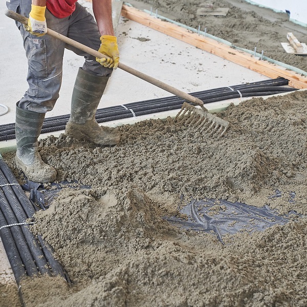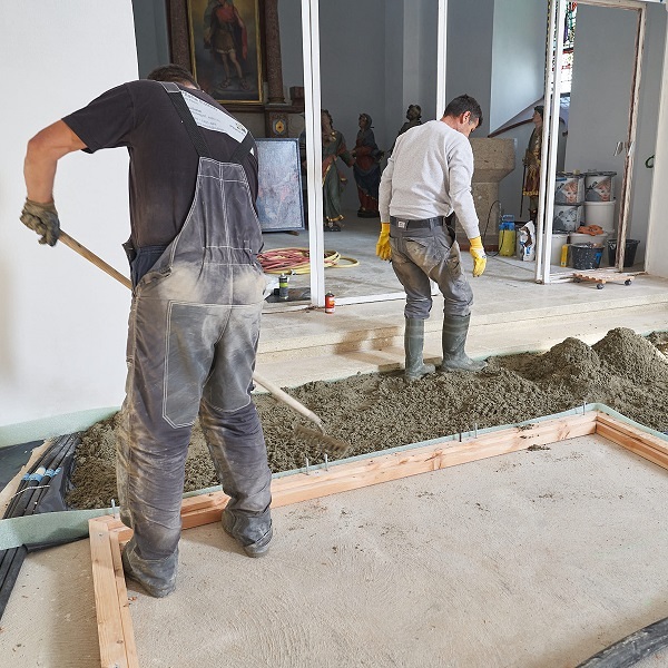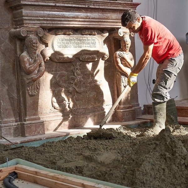 Heute hat die Firma Polzinger den Estrich im Kirchenschiff eingebracht. Ruckzuck. Und die Oberfläche schön geglättet, damit die Bodenplatten verlegt werden können. Ruckzuck.