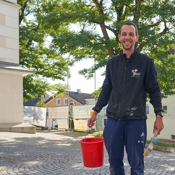 Die Malertruppe mit Horst Reimair, Franz Strasser und Franz Emathinger jun. hielt sich im vorderen Bereich der Kirche auf. Sie „weißigten“ den Stiegenaufgang zur oberen Sakristei (Ministrantensakristei).
