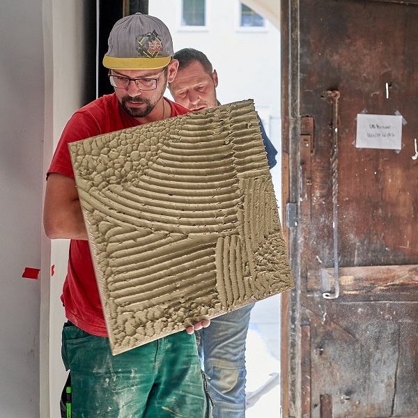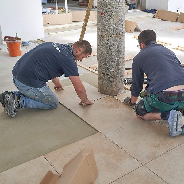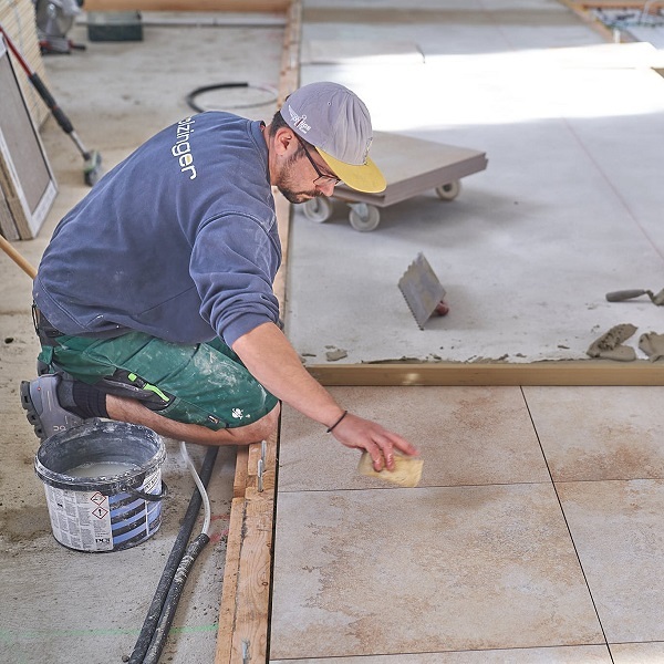 Im Mittelgang arbeiten sich die beiden Männer der Firma Polzinger Platte für Platte zurück zur Eingangstüre. Hilfreich dabei ist eine akkubetriebene Saugglocke. Dadurch können Platten angehoben und mit einer Hand exakt auf den Fliesenkleber aufgesetzt werden. Auch an kniffligen Stellen.