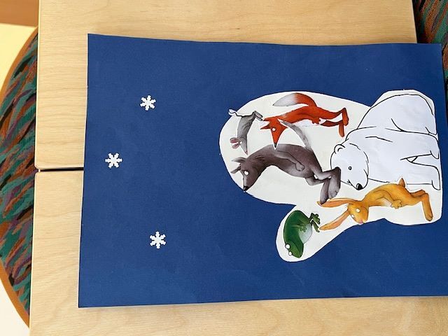 Es wurde anschließend kräftig geschnitten und geklebt, sodass jedes Kind ein eigenes Bild der Geschichte mitnehmen konnte. Das aufmerksame Zuhören und fleißige Basteln macht natürlich hungrig. Es wurde noch gejausnet bevor sich die Kinder mit einem Winterlied als Dankeschön verabschiedeten.
