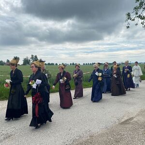 Dahinter die Goldhaubenfrauen in ihren prächtigen Gewändern und erst dann folgt die überschaubare Schar der Gläubigen, die die Tradition der Fronleichnamsprozession hochhalten.