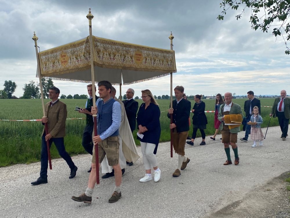 Der Priester (Prof. Michael Rosenberger), schreitet unter dem kostbar bestickten seidenen „Himmel“, der von den vier Vertretern der Bauernschaft getragen wird und präsentiert die Monstranz mit der Hostie, dem „Leib des Herrn“.