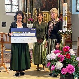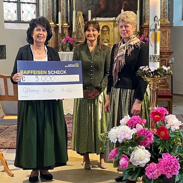 Am Schluss übergaben die beiden Obfrauen der Goldhaubengruppe, Birgit Kastenhuber und Edith Meindlhumer, einen Scheck im Wert von 3.000,-- Euro an die Pfarrgemeinde für die anstehende Sanierung des Kirchendaches.