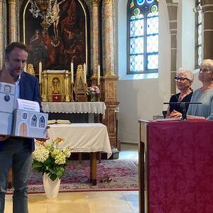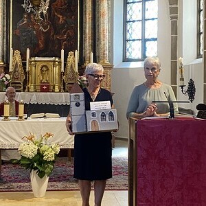 Am Schluss des Gottesdienstes erhielt die Pfarrgemeinde ein großzügiges Festtagsgeschenk. Marianne Hoheneder, die Leiterin der Kreativgruppe, überreichte die namhafte Spende von 3.000 Euro – stilgerecht verpackt in der „Kirche ohne Dach“, die Susanne Braunsteiner maßstabsgetreu als Spendenbox angefertigt hatte.