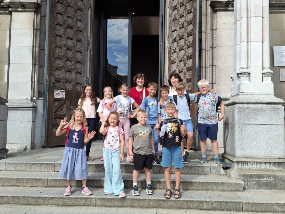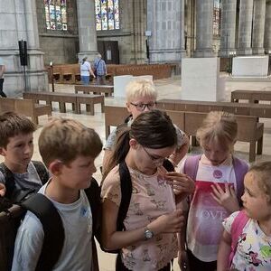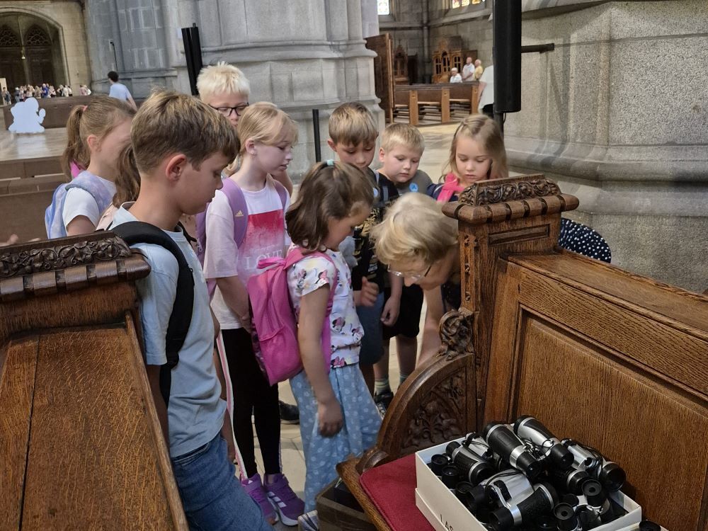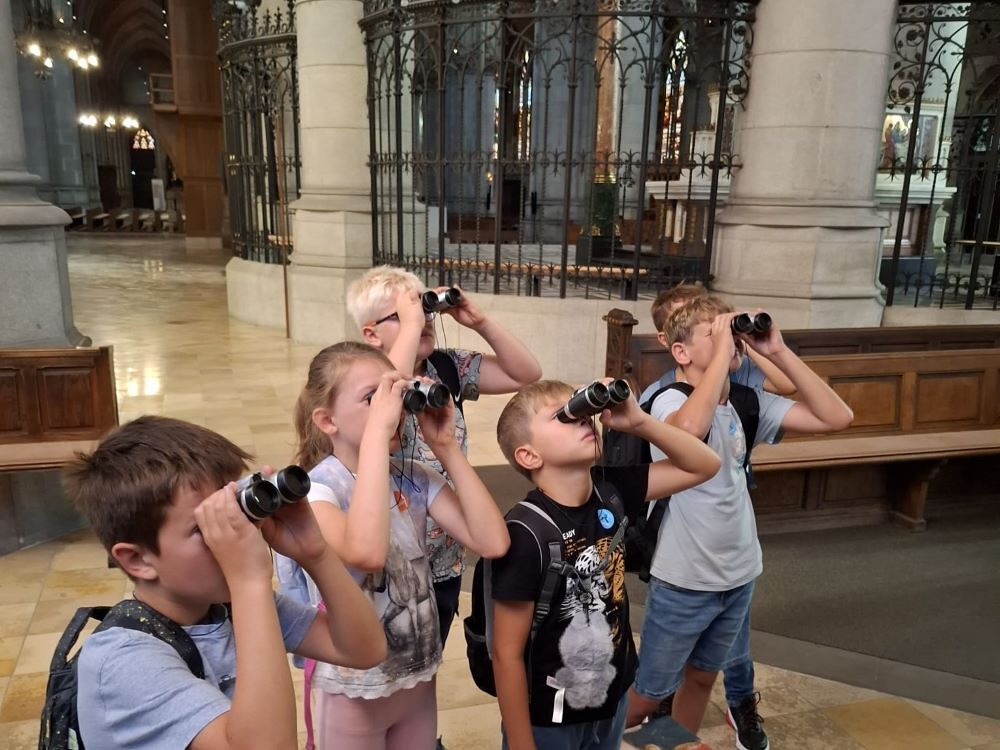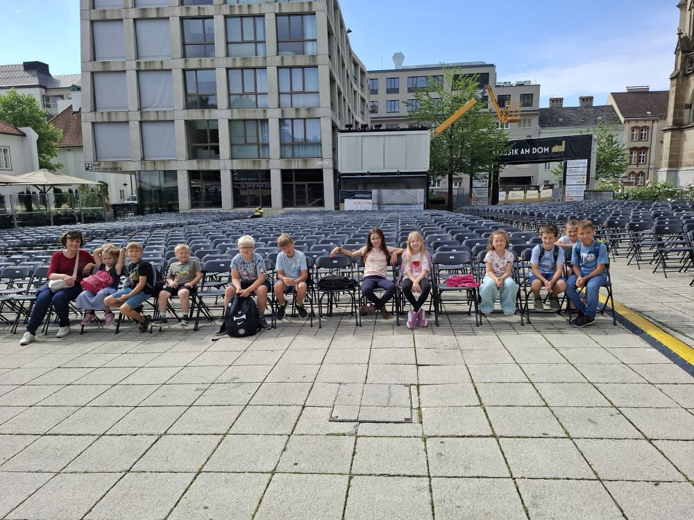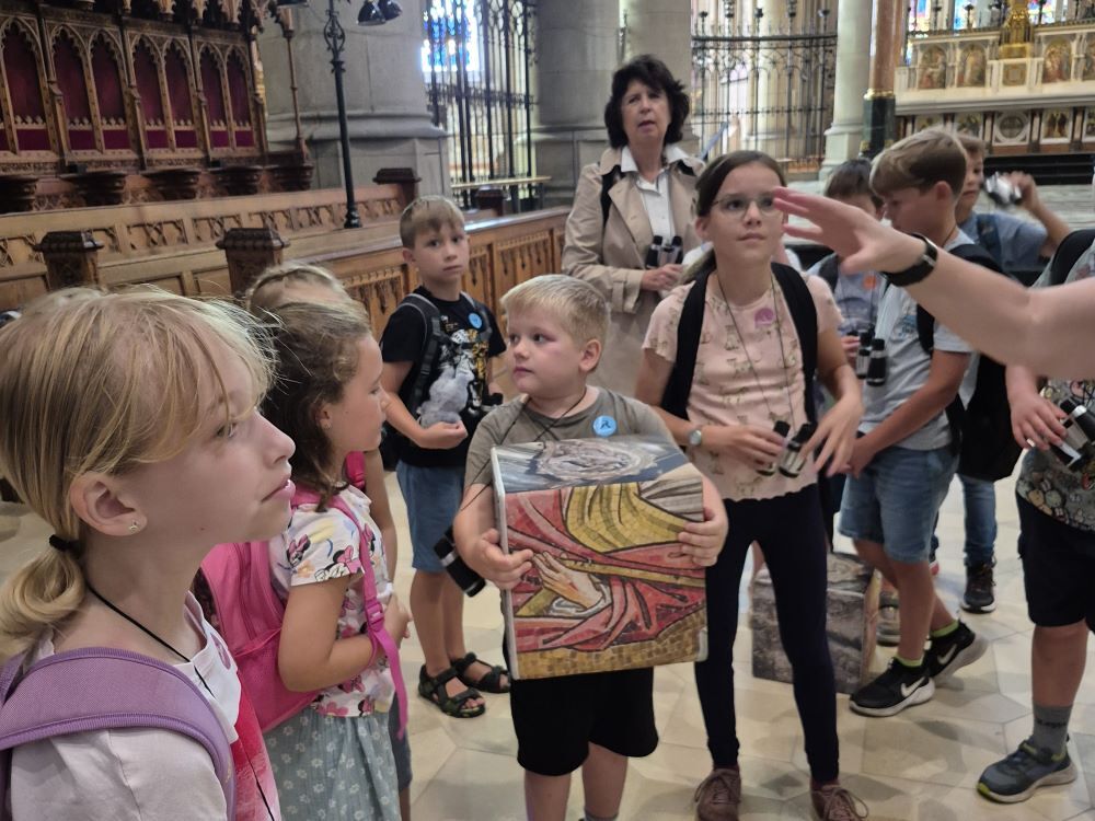 Dabei ging es darum, bestimmte Motive und Bildausschnitte im Innenraum der Kirche im Original zu entdecken. Da musste man schon mit Argusaugen herumgehen und durch die bereitgestellten Ferngläser schauen, um die teils sehr kniffeligen Aufgaben möglichst schnell zu lösen. Die der Gruppe zugeteilte Domführerin erzählte viele interessante Details zum Bau des Domes, zu seinen beeindruckenden Ausmaßen und den fünf (!) Orgeln, zu Statuen, Fenstern und anderen Schmuckelementen. So bekamen die Kinder einen guten Eindruck von der Innenausstattung und der Atmosphäre in der flächenmäßig größten Kirche Österreichs.