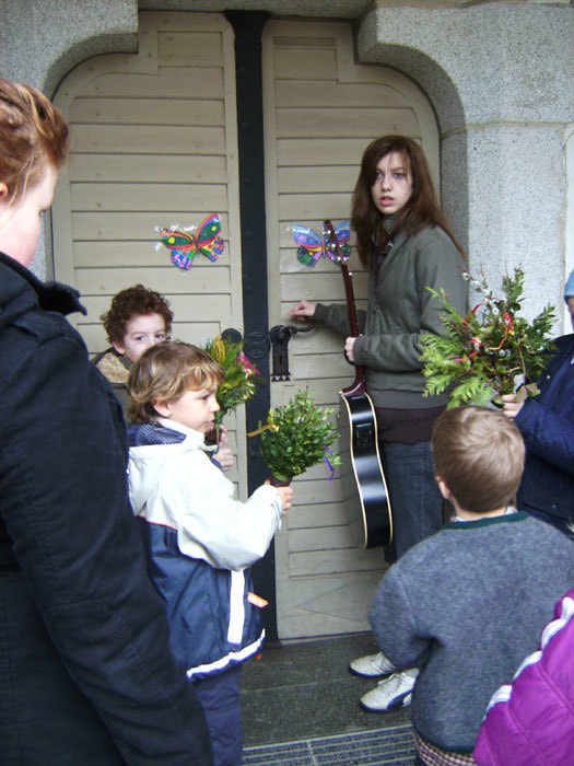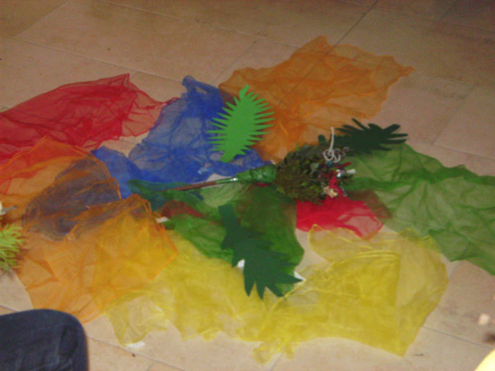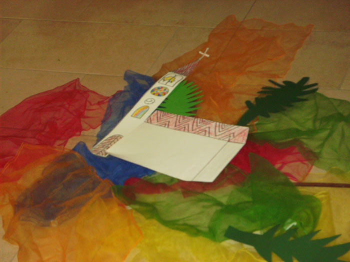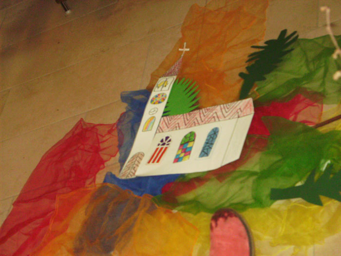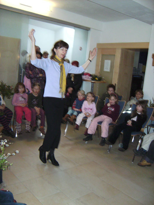 Dort haben wir das heutige Evangelium bildlich dargestellt und einen kleinen Schreittanz zum Loblied "Heilig bist du" gelernt, bei dem wir dann auch die Erwachsenen in der Kirche teilhaben ließen.
