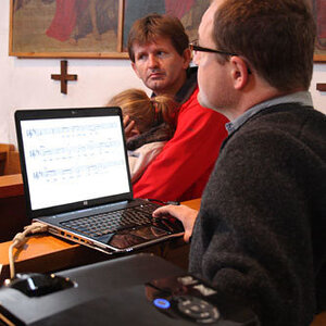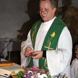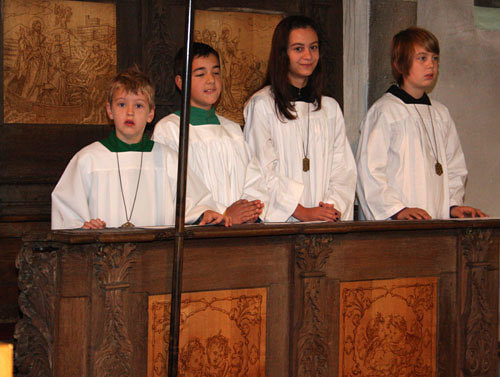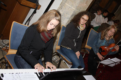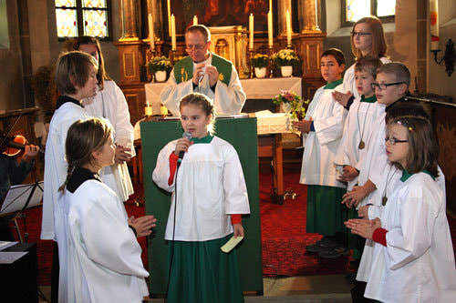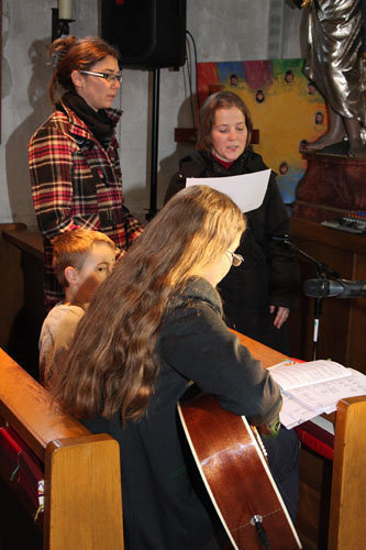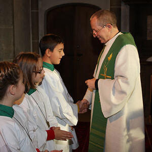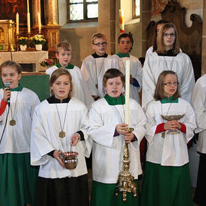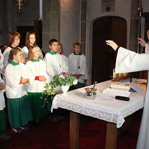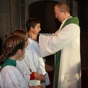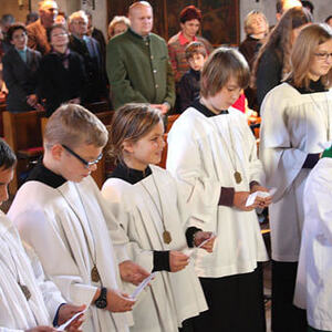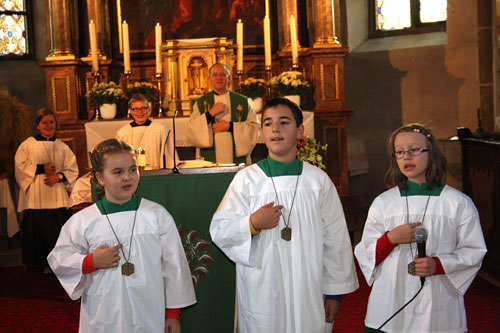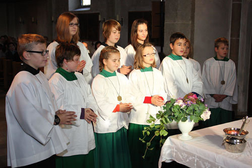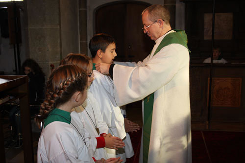 Anschließend erfolgte die Aufnahme der neuen Ministranten/innen Anja Piecuch, Laura Schätz und Julian Kastner, die als sichtbares Zeichen eine Kette mit Anhänger erhielten.
