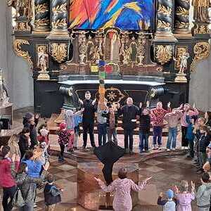 Das Wetter war perfekt und so starteten wir, von unserer wunderschönen Pfarrkirche aus, den in sieben Stationen aufgeteilten letzten Weg Jesu. Jedes Kind bekam am Anfang ein kleines Kreuz und hierzu bei jeder Station eine Art Puzzleteil in verschiedenen Farben - damit das Kreuz am Ende bunt war.