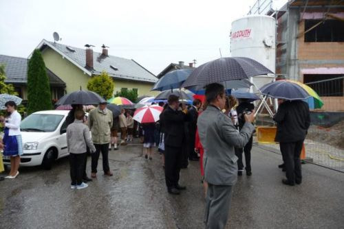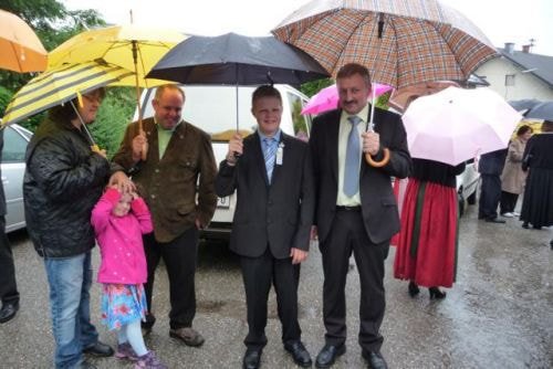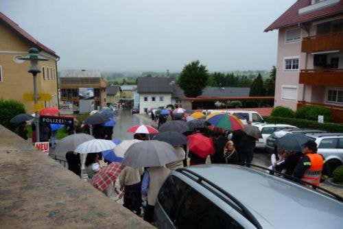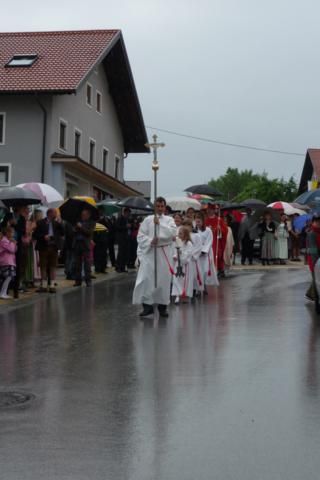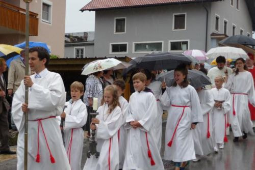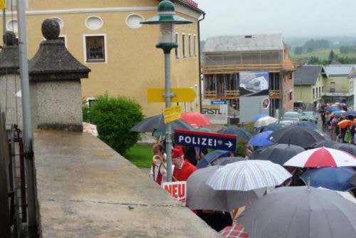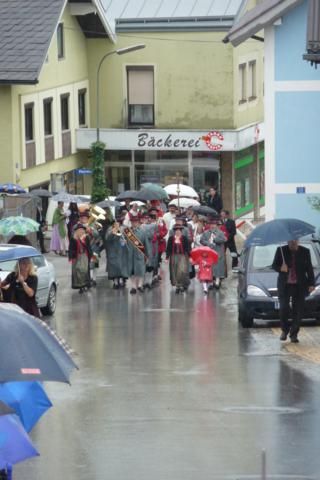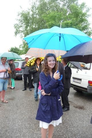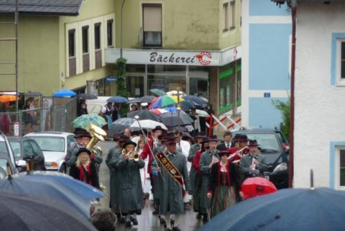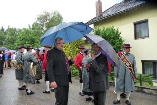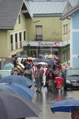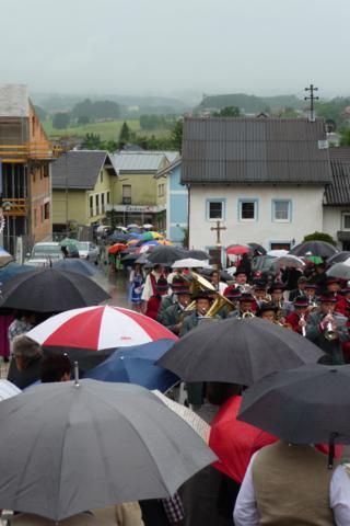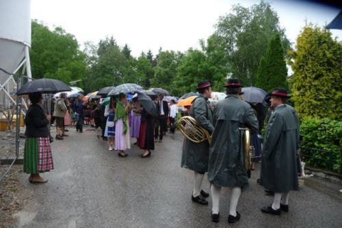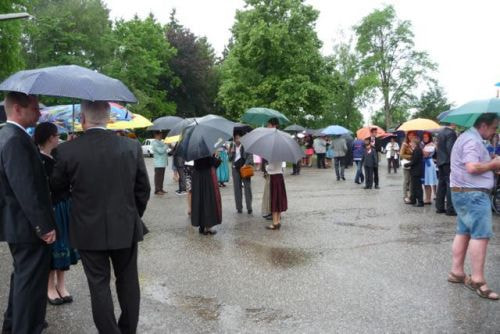 Zum einen, weil der Festumzug in die Kirche zu einem "Meer aus Regenschirmen" wurde, da es ordentlich Weihwasser vom Himmel regnete.