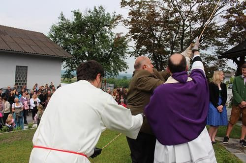 Unser Herr Pfarrer Markus Menner weihte und salbte die neue Glocke und übernahm für diese Glocke auch die Patenschaft. Wie wir ihn alle kennen, konnten wir ihm als „Glocken-Göd“ sehr viel Freude machen.