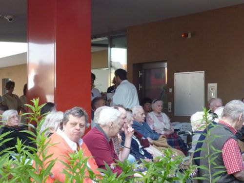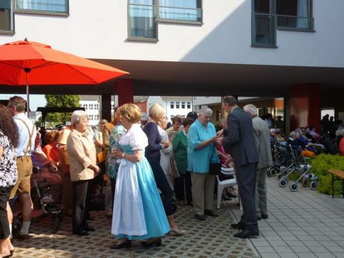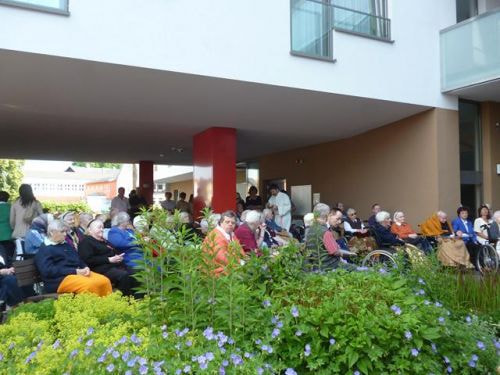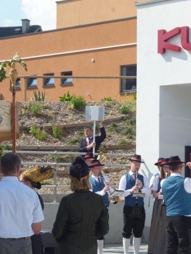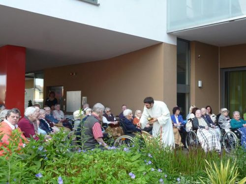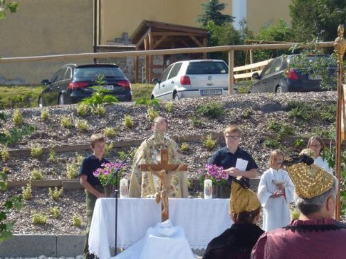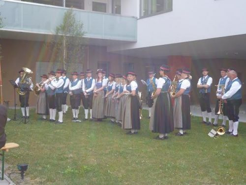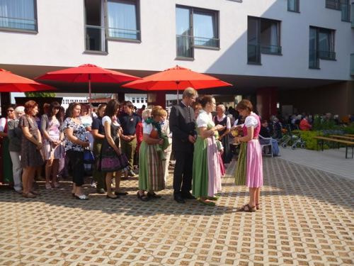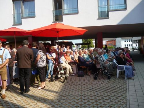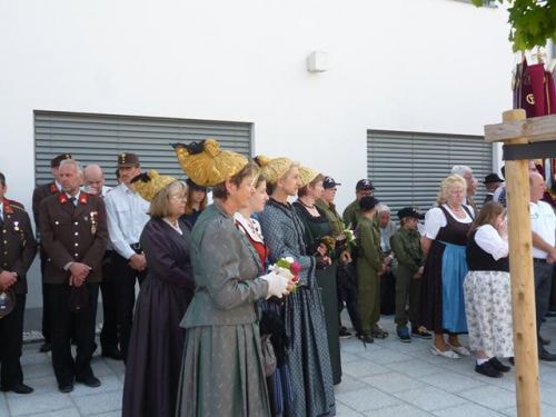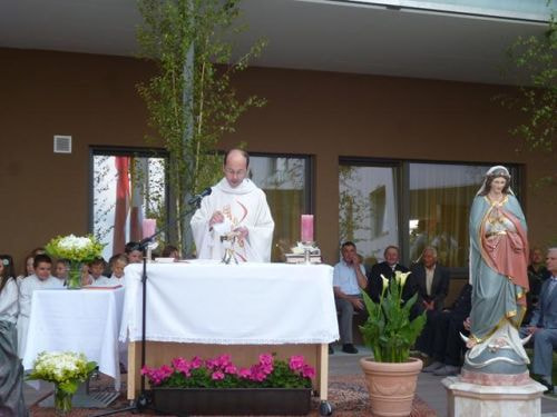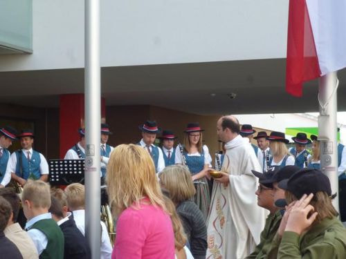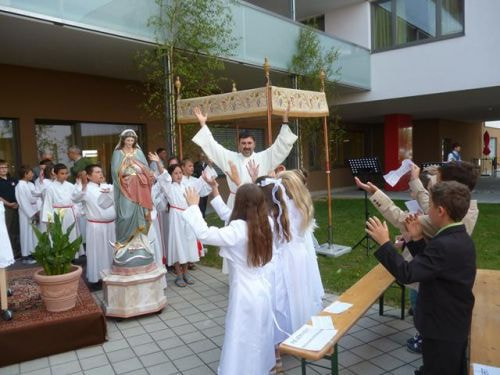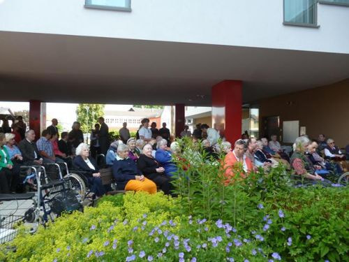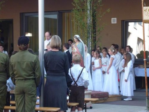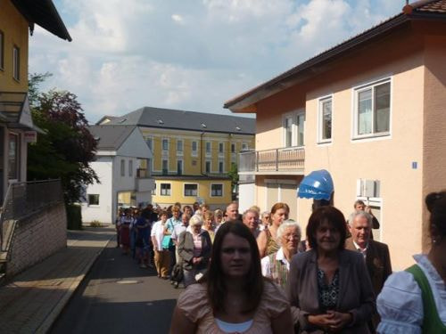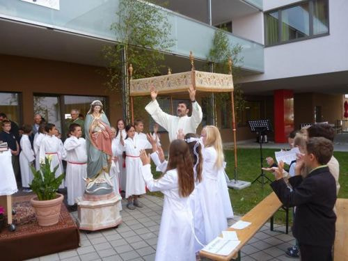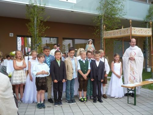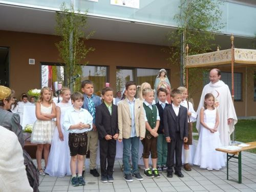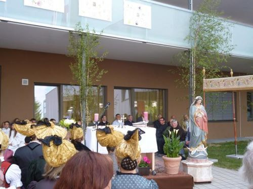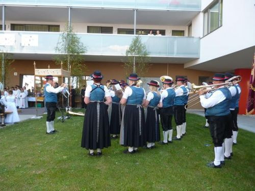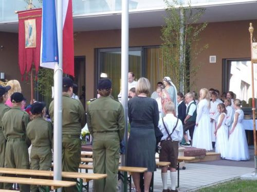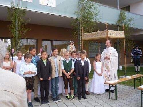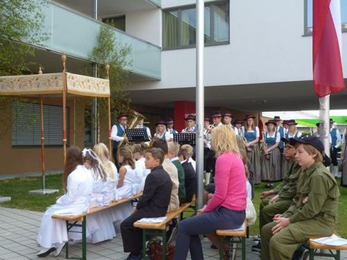 Messfeier beim Pflegeheim mit den Erstkommunionkindern, der Marktmusikkapelle, den Goldhauben, dem Kameradschaftsbund, den freiwilligen Feuerwehren, den Sportlern, der Gemeindevertretung, der Pfarrgemeinde, den Ministranten, den "Himmel-Trägern" und natürlich den Bewohnern und Betreuern des Pflegeheimes Ostermiething.