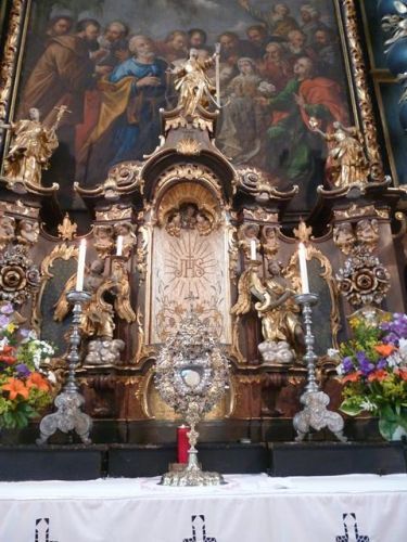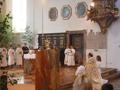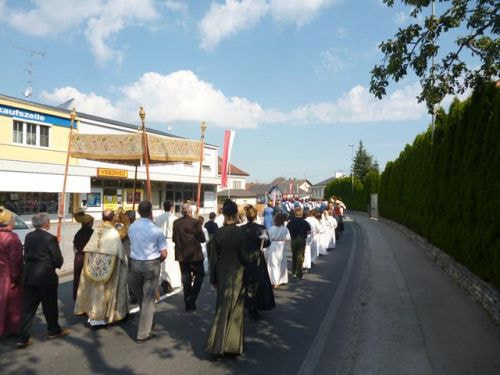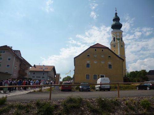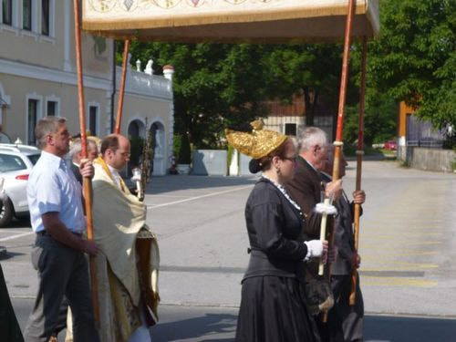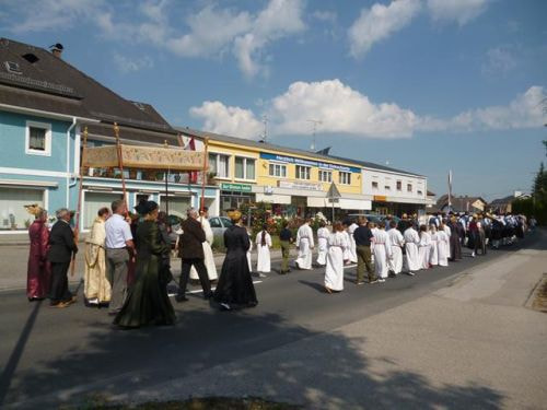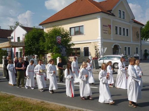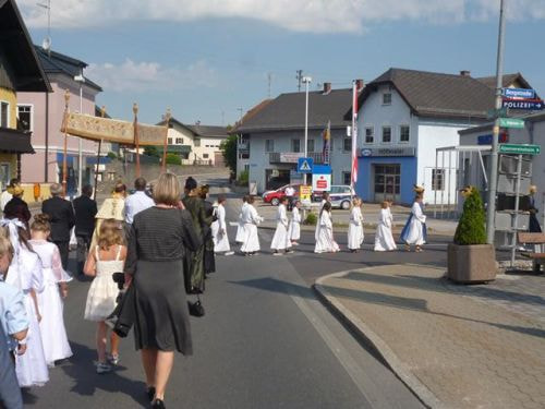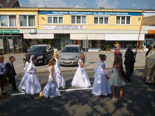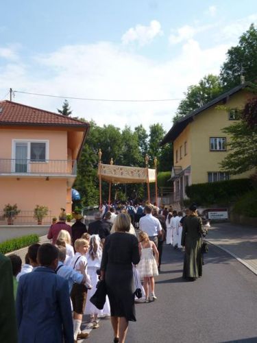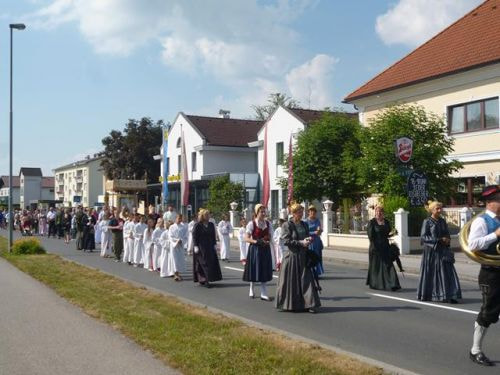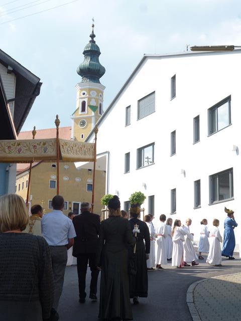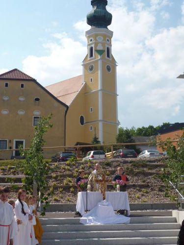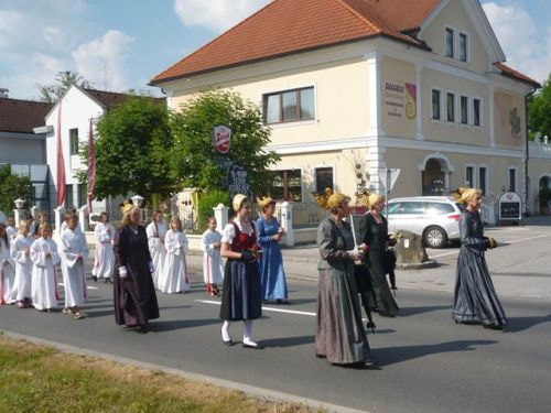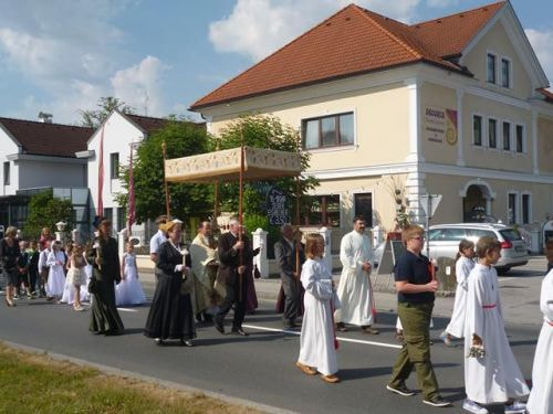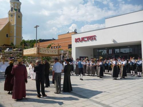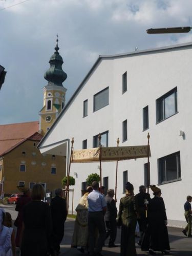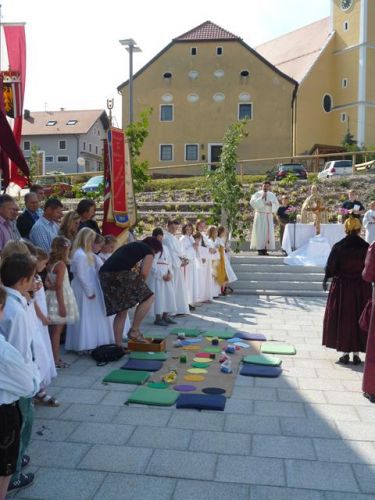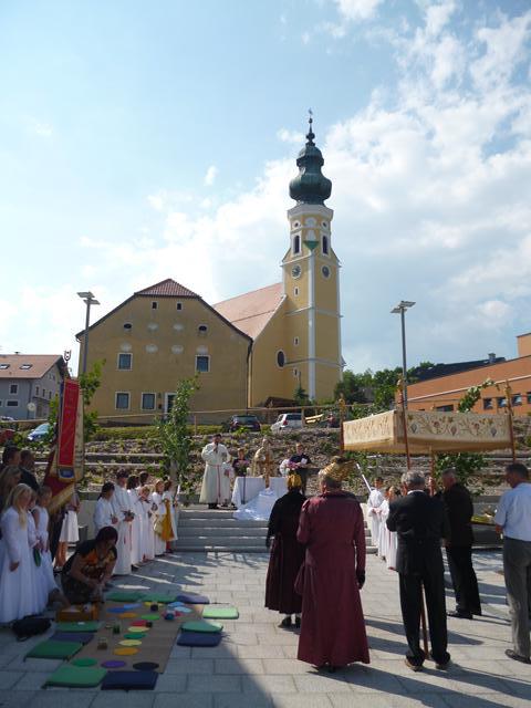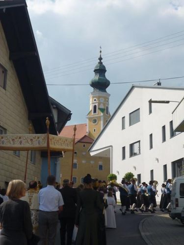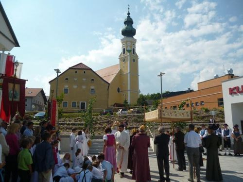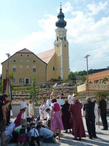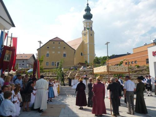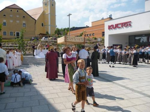 Eines der schönsten Kirchenfeste im Jahr ist Fronleichnam: mit dem "open-air" Gottesdienst beim Pflegeheim, dem feierlichen Umzug mit den Vereinen, begleitet von der Marktmusikkapelle, den geschmückten Häusern, Straßen und den Segens-Stationen unterwegs.