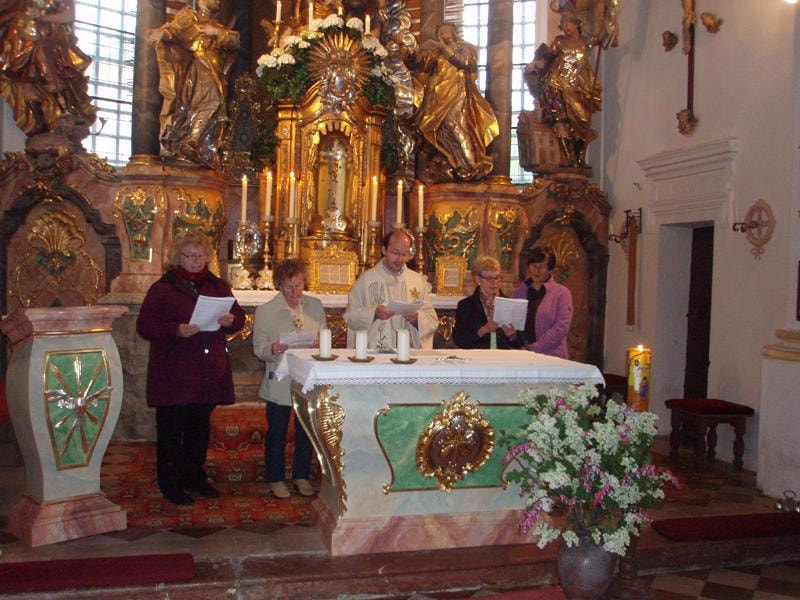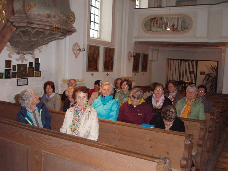 Wir wurden dort vom Mesner erwartet und kamen gerade noch trockenen Fußes in die Kirche. Nach der Maiandacht, die Herr Pfarrer Menner zusammen mit dem KFV Leitungsteam gestaltete, wurde uns die Kirche erklärt. Maria Anzenberg, eine wunderbare Rokokokirche, gehört zur Pfarre Massing und ist eine beliebte Hochzeitskirche. Der Mesner trug uns zum Schluss seine Gedanken in Gedichtform vor. Das was sehr beeindruckend.