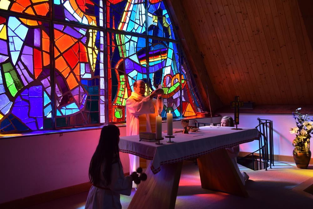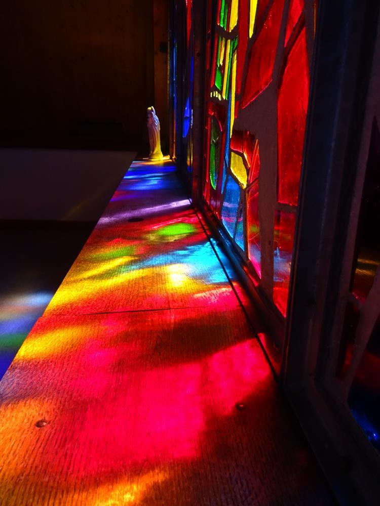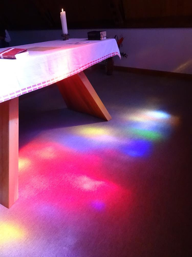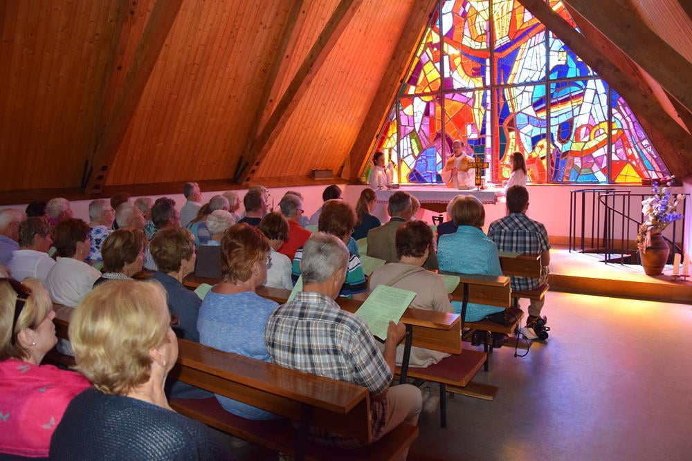 Unser Herr Pfarrer Mag. Markus Menner hielt mit uns gemeinsam die Wallfahrtsmesse und ging dabei auf die Bedeutung der Dreifaltigkeit, welche im Glasfenster dargestellt ist, ein. Im Hintergrund untermalte das leuchtende Mosaik diese Messe auf besondere Weise.