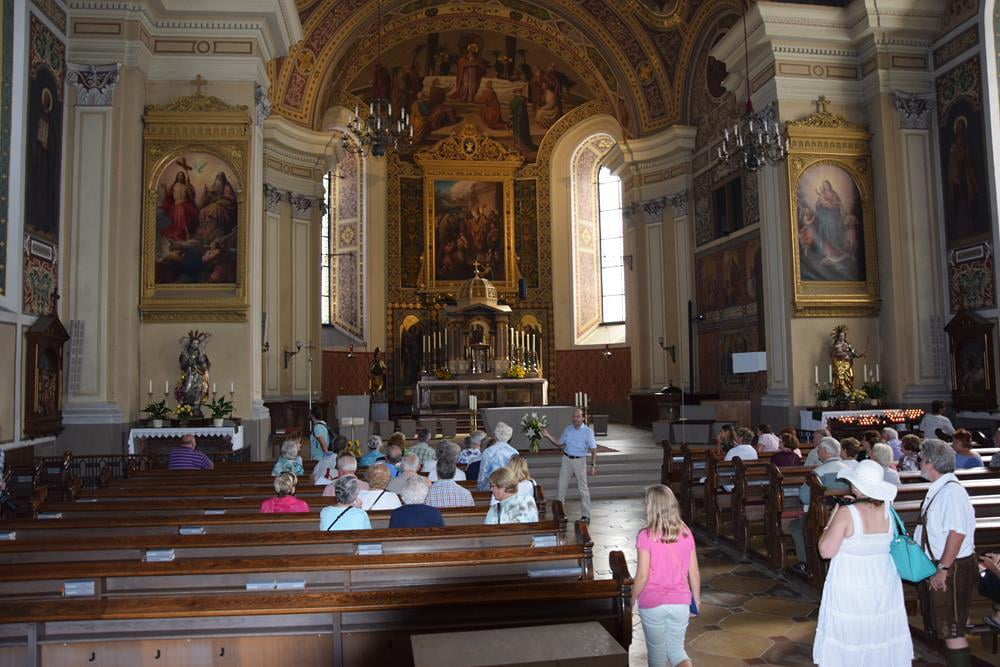Anschließend ging es wieder talwärts und in Richtung Bad Ischl. Dort, nach einer kurzen Kirchenführung mit unserem Pfarrer Markus Menner, (was sein muss, muss sein) wartete die lang ersehnte Abkühlung in Form eines Eisbechers beim Zauner oder eines erfrischenden Fußbades im Bach.