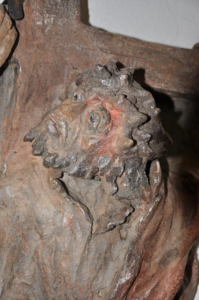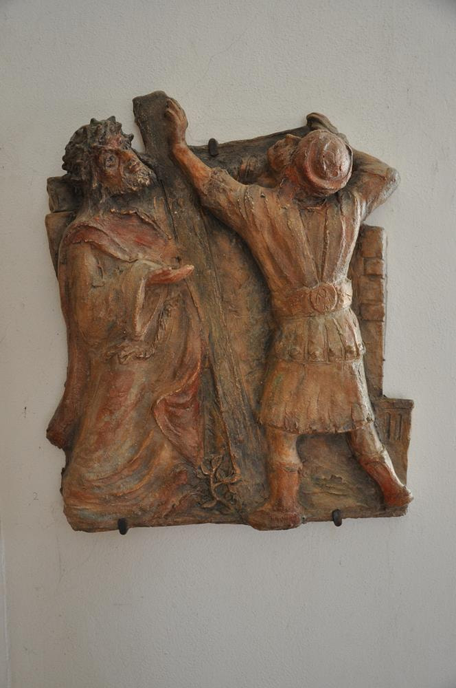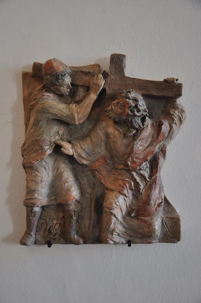 Simon von Cyrene hilft Jesus das Kreuz tragen.