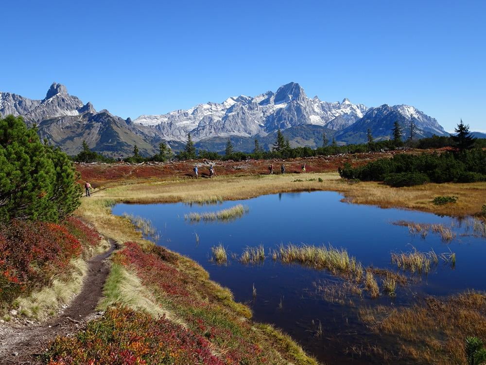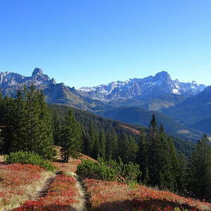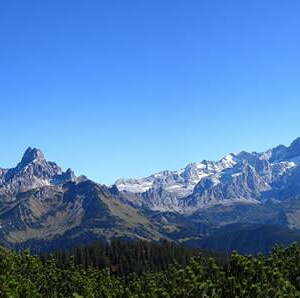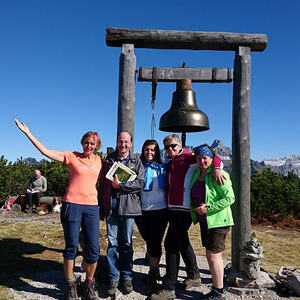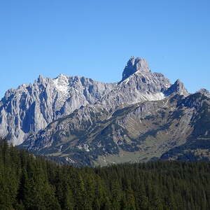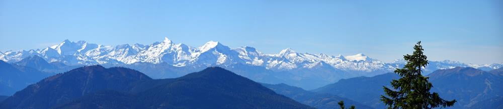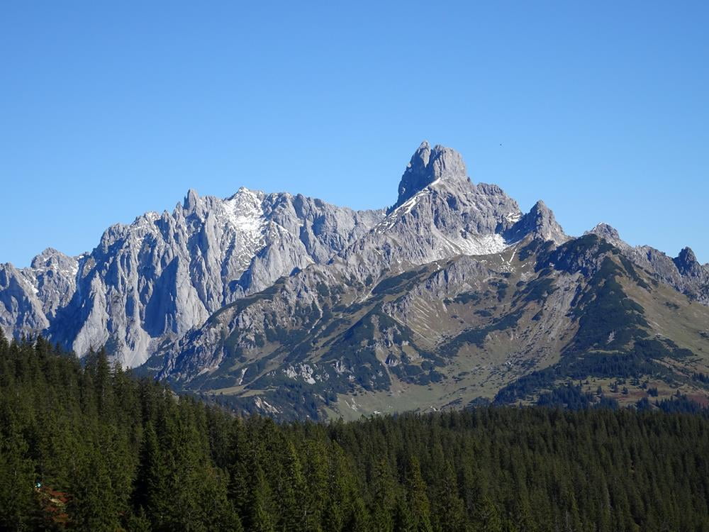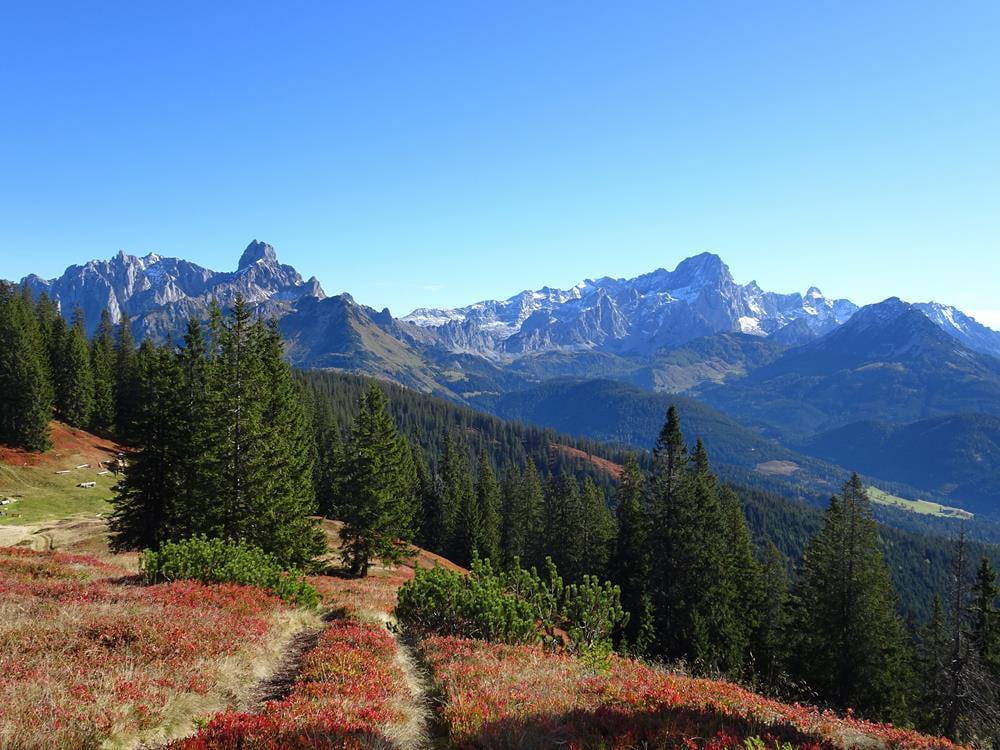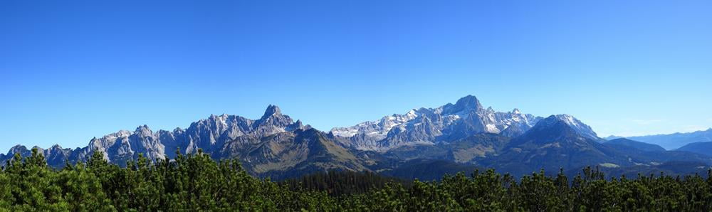 Überwältigend stellt sich auch die Aussicht vom Gerzkopf dar. Wir genossen vom Gipfel aus einen herrlichen Ausblick über den Gosaukamm, das Dachsteinmassiv, das Tennengebirge und die Niederen Tauern. Die markante Bischofsmütze beherrscht das Bild im Osten, in weiter Ferne ragen die Gipfel der Hohen Tauern empor.