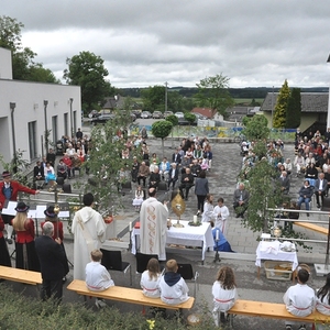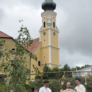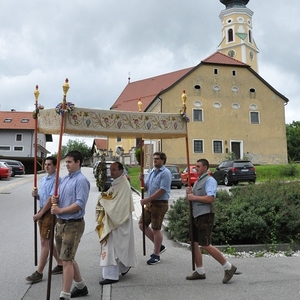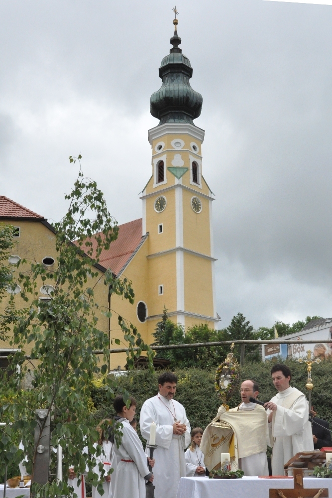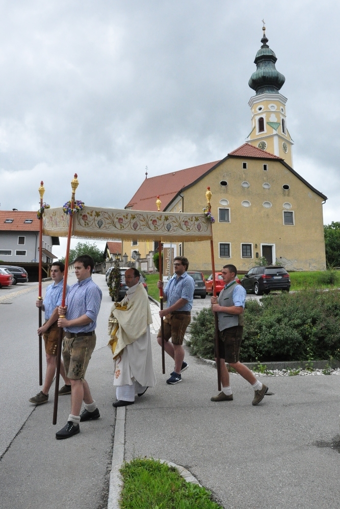 Mit dem ebenfalls mit kunstvollen Kränzen geschmückten Himmel ging es dann, am Pfarrhof vorbei, zur Kirche.