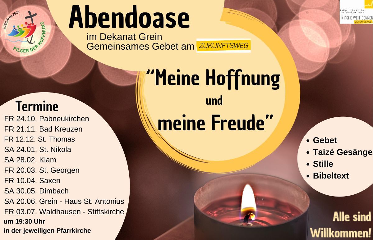 Die Abendoase findet jedes Monat in einer anderen Pfarrkirche statt. Diese Gebetszeit bietet Raum, um Kraft zu tanken und sich von Gottes Wort stärken zu lassen, weil Gott immer bei uns ist und uns Hoffnung schenkt. Das Gebet ist getragen von den Gesängen aus Taizé, Bibeltexten, Stille und einfachen Gebeten. Wir freuen uns über alle Pilger:innen, die mit dabei sind und auch in andere Pfarrkirchen zur Abendoase kommen.