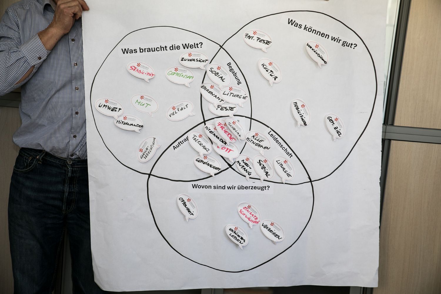 In einem kreativen und intensiven Arbeitsprozess näherten sich die Gruppen anschließend der Frage nach Sinn und Auftrag der zukünftigen Pfarre. Ausgangspunkt waren Fragen wie: Was braucht die Welt? Was können wir als Kirche gut? Wovon sind wir überzeugt? Ziel war es, einen Satz zu formulieren, der den Auftrag der Kirche in unserer Region ausdrückt.