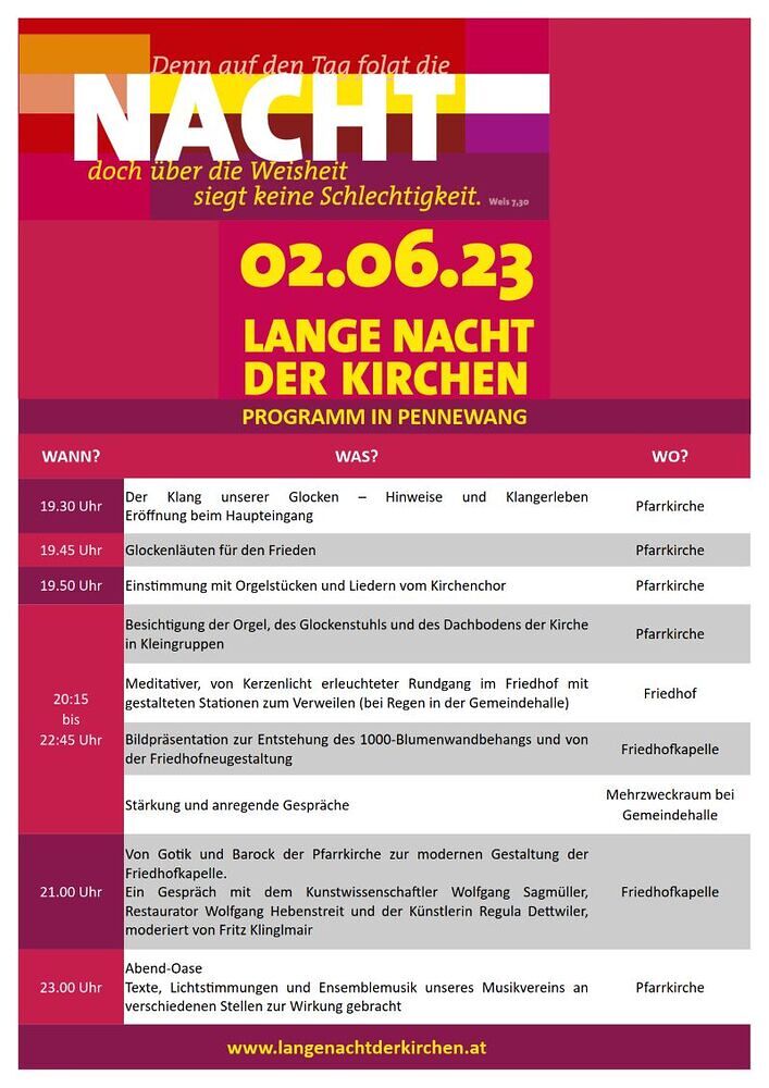 Bei dem mit Kerzen beleuchteten Friedhof wurde zu einem meditativen Rundgang, betreut von Renate Aicher, eingeladen. In der Friedhofskapelle sprachen der Kunstwissenschaftler Wolfgang Sagmüller, der Restaurator Wolfgang Hebenstreit und die Künstlerin Regula Dettwiler über ihre Arbeit bei der Renovierung der Pfarrkirche und der Neugestaltung der Friedhofkapelle und gaben interessante Details sowie heitere Anekdoten preis. Dazu wurden auch Bildpräsentationen im Durchlauf gezeigt.
