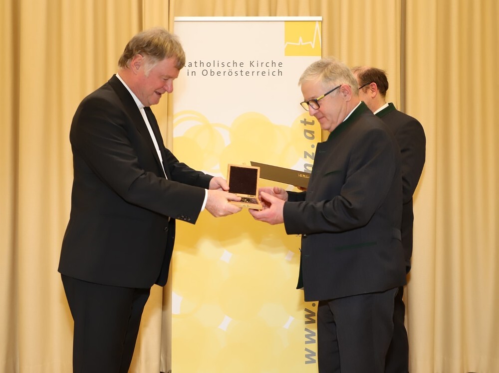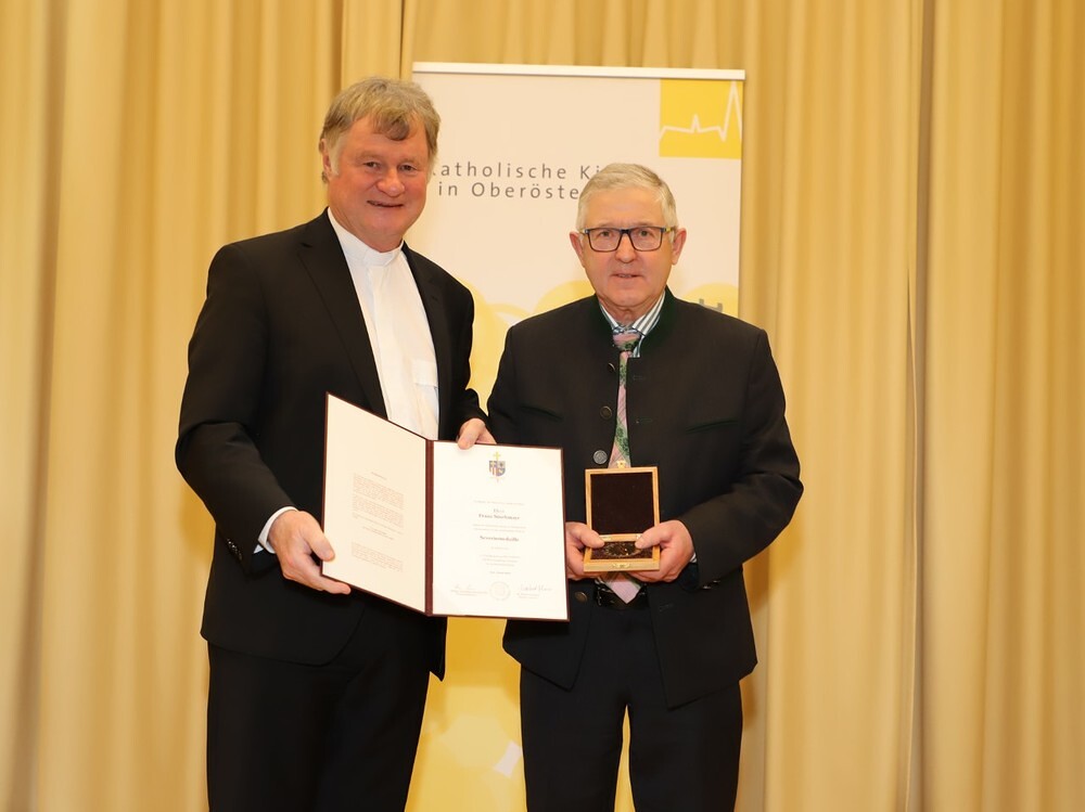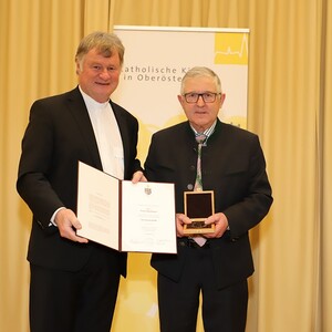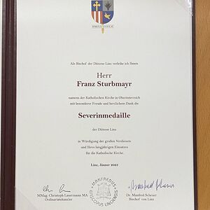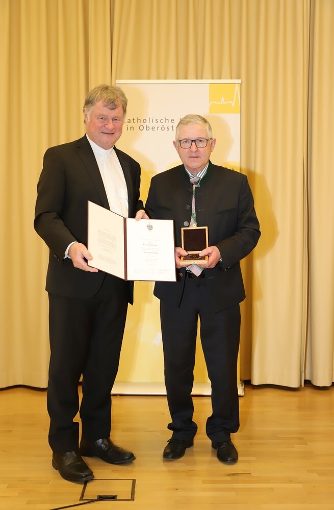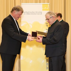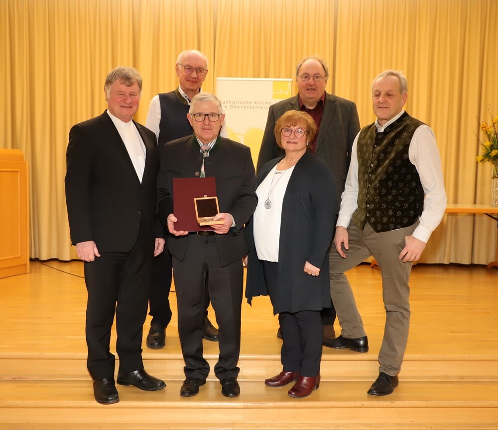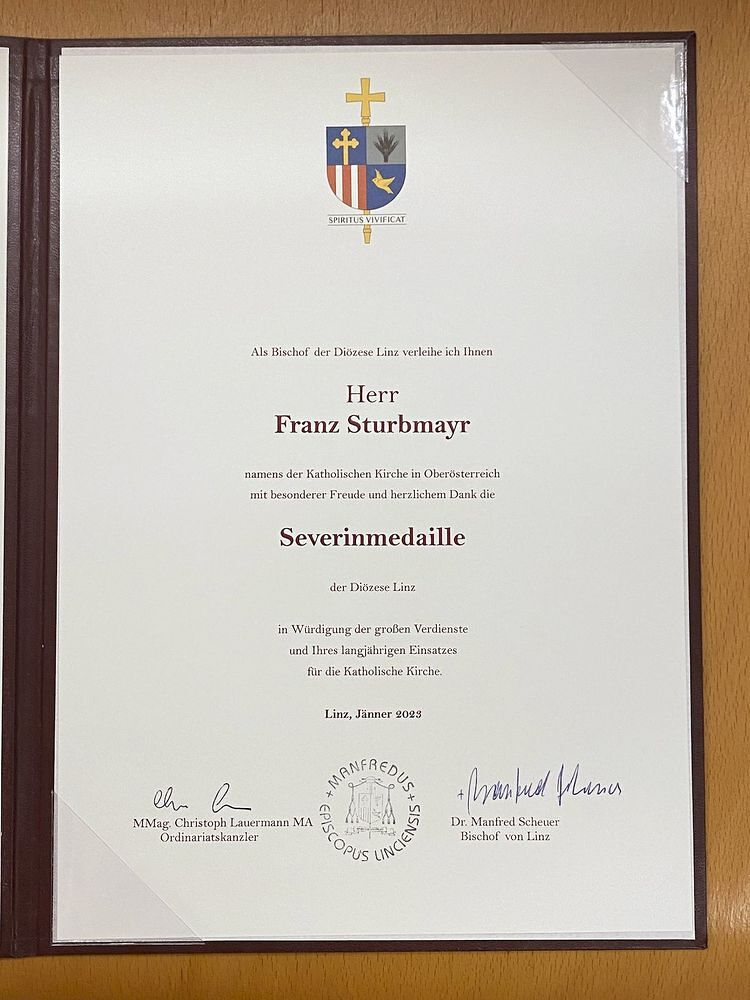 „… Neben verschiedenen Vereinstätigkeiten im Ort haben sie sich immer auch in besonderer Weise für die Pfarre Pennewang eingesetzt. Sie waren von 1992-2017, also 25 Jahre, Mitglied im Pfarrgemeinderat und von 1997-2017, also 20 Jahre, Obmann. Weitere fünf Jahre waren sie Mitglied im Finanzausschuss. Sie haben in alle den Jahren große Umsicht bei notwendigen Arbeiten in der Pfarre bewiesen und werden für ihren ehrlichen und freundlichen Umgang mit der Pfarrbevölkerung sehr geschätzt. Besondere Verdienste haben sie sich bei der Außen- und Innenrenovierung der Pfarrkirche und der Renovierung der Kapelle Felling erworben. Außerdem waren sie zudem ein sehr zuverlässlicher Verwalter des Kirchenwaldes und sie sind weiterhin als Rechnungsprüfer der Pfarre tätig.