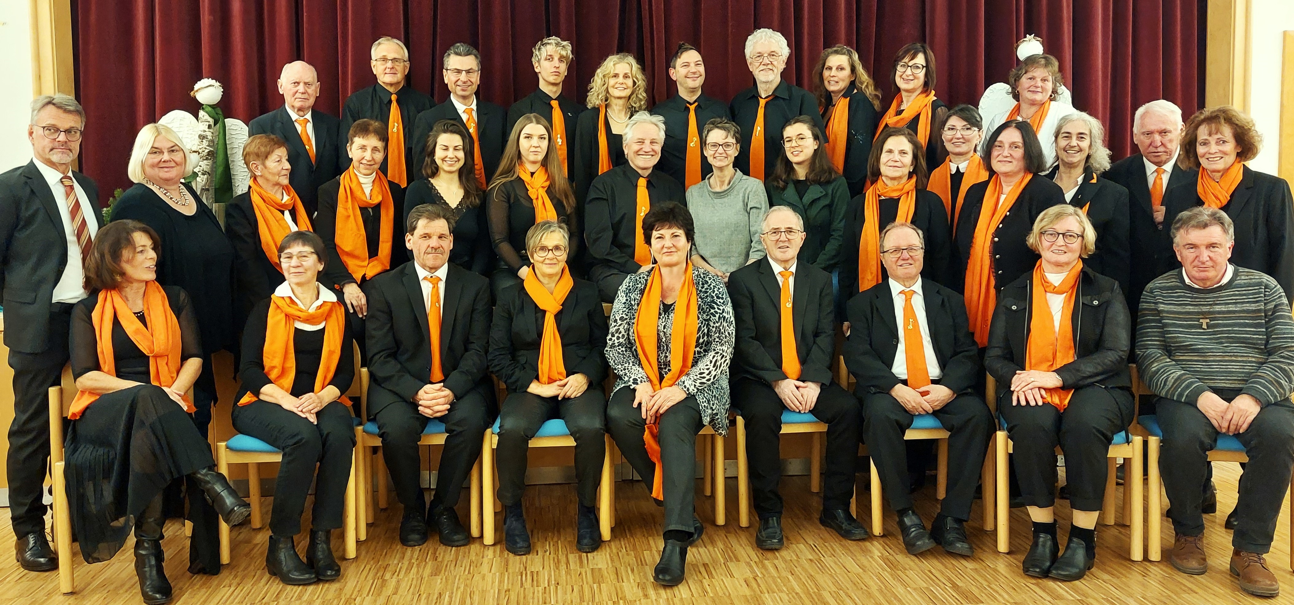 Pfarrer Mag. Konrad Hörmanseder, der die Messe zelebrierte, drückte sein Wohlwollen und seine Dankbarkeit dem Kirchenchor gegenüber in seiner Predigt und auch bei den Fürbitten aus. Das gemischte musikalische Programm von modernen liturgischen Liedern, über einen Gospel, bis hin zur Volksmusik fand bei den Messebesuchern großen Anklang. Bei der anschließenden Feier im Pfarrheim stärkte man sich zuerst bei einem kalten Buffet, zu dem der Chor nicht nur alle Sänger*innen, sondern auch die Musiker*innen, den Herrn Pfarrer, Kaplan Kenneth, Dr. Ruhsam und die Obfrau des Pfarrgemeinderates, Christa Schabetsberger, eingeladen hatte. Diese bedankte sich in ihrer Rede beim Chor für die langjährige Tätigkeit und hob besonders verdienstvolle Chormitglieder und die Chorleiterin hervor. Anschließend wurden 22 Chormitglieder für Ihre Mitgliedschaft von 15 Jahren aufwärts bis zu 30 Jahren mit Urkunden und silberner/goldener Nadel der Diözese geehrt. Von der Chorleiterin gab es für alle noch eine Mon Cherie oder Merci nach Wahl. Diese wiederum erhielt eine sehr schön gestaltete Kugel aus Ton, eigens hergestellt von der Obfrau Elisabeth Aigner und eine Flasche Schlumberger, auf der sich alle Sänger*innen verewigt hatten. Danach wurde noch viel gesungen und sogar getanzt. Alles in allem waren diese Jubiläumsmesse und die Feier ein wunderschönes Erlebnis.