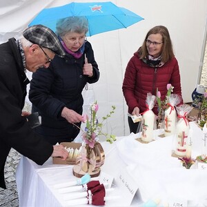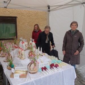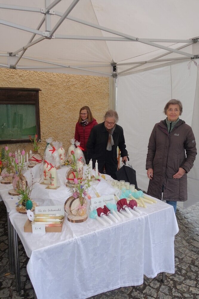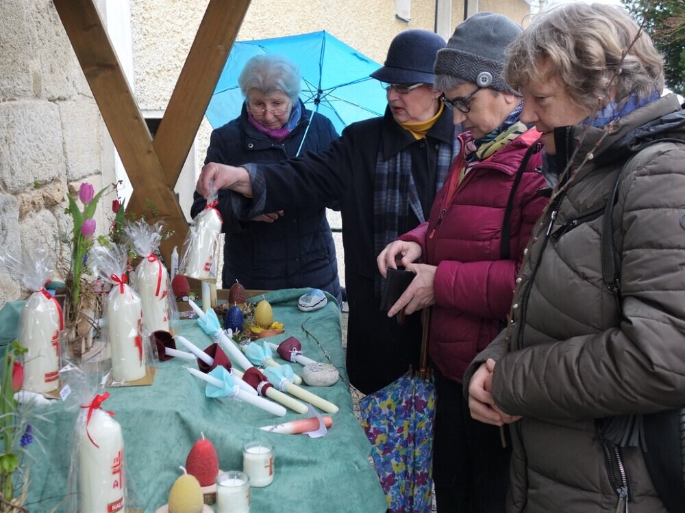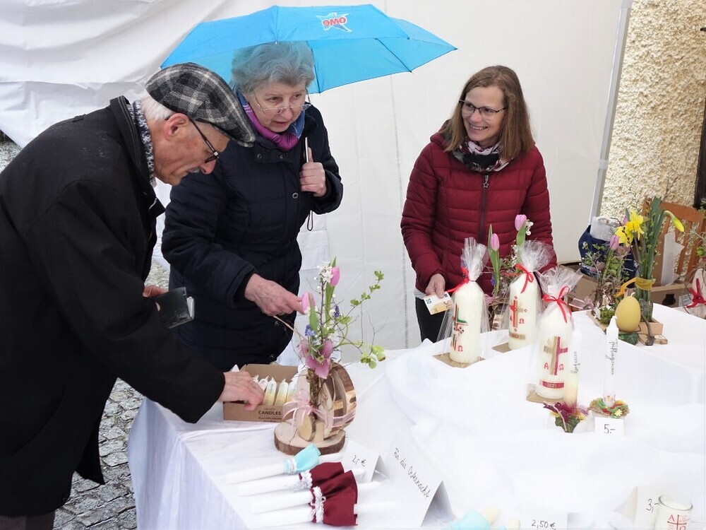 Eine schöne Kerze sollte zu Ostern auf keinem Tisch fehlen - überlegte das Fachteam Soziales und bot am Palmsonntag selbst hergestellte bzw. selbst verzierte Osterkerzen zum Kauf an. Das Wetter war an diesem Tag alles andere als ideal. Werden sich überhaupt bei Regen, Wind und Kälte die Pergkirchnerinnen und Pergkirchner Zeit zum Aussuchen und Kaufen der Kerzen nehmen? Es war schön zu sehen, dass sich die Menschen vom schlechten Wetter nicht abschrecken ließen und die eine oder andere Osterkerze kauften. Sie wussten ja, dass der Erlös der Pfarre Pergkirchen zugutekommen würde, und zwar für die Bewirtung der Freiwilligen beim Pfarrhofumbau. Wir hoffen, dass endlich mit diesem langersehnten Projekt begonnen werden kann. Aber das ist wieder eine andere Geschichte.