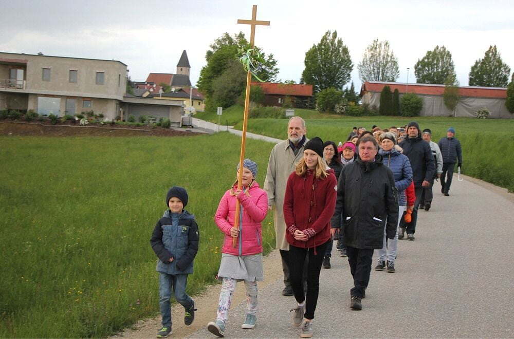 Von einem „wetterfesten Christentum“, das es in unseren Zeiten oft einmal brauche, sprach Bischofsvikar Willi Vieböck bei der Maiandacht der Pfarre Pergkirchen in Tobra. Diese Wetterfestigkeit bewiesen auch die Teilnehmer der Prozession und anschließenden Andacht, die von der Pfarrkirche nach Tobra führte – bei einstelligen Temperaturen sowie dem einen oder anderen Regentropfen. Dennoch waren rund 50 Pilger auf dieser Strecke unterwegs, die auch den Auftakt für die alljährliche Wallfahrt von Pergkirchen nach Mariazell bildet. Vor der Strohbauern-Kapelle erwarteten zudem zahlreiche Menschen aus Tobra und Auhof auf die Prozessionsteilnehmer. Traditionelle Marienlieder sowie Impulse über Jesus, der uns „Brot des Lebens“ geschenkt hat, waren die inhaltlichen Schwerpunkte der Andacht. Zum Ausklang lud die Familie Holzer noch zum gemütlichen Beisammensein bei Most und Brot ein.