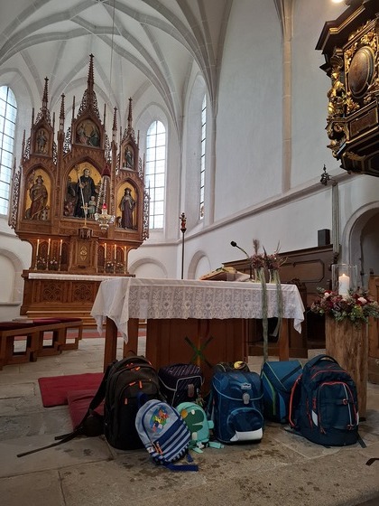 Die Segnung der Schultaschen und Kindergartentaschen sollte diese Nähe besonders darstellen. Pfarrer P. Daniel segnete die mitgebrachten Taschen und jedes Kind oder auch Jugendliche erhielten dazu auch den Einzelsegen.