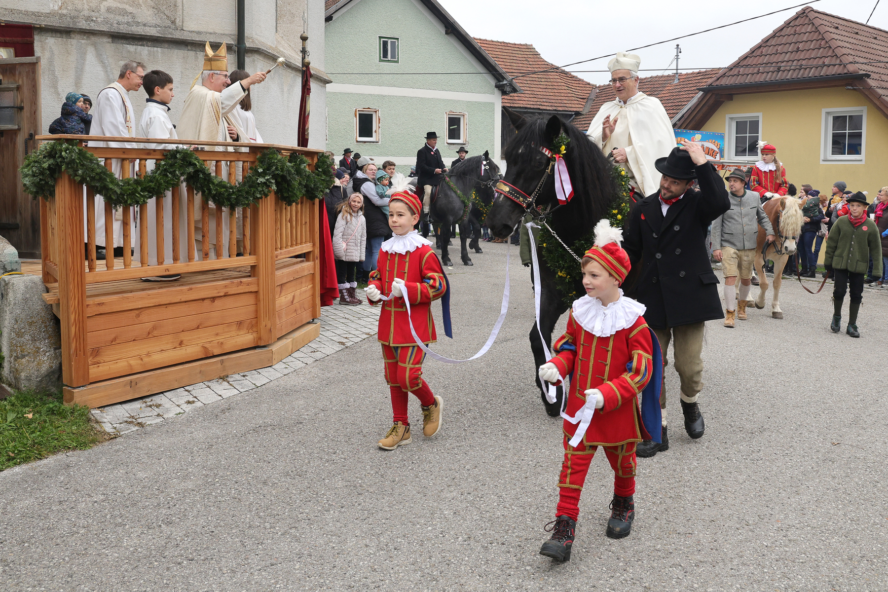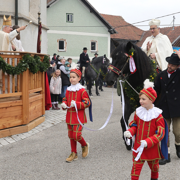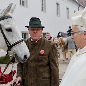 Bei der Kirche in Heiligenleithen wartete der Zelebrant der Rittmesse, in diesem Jahr unser Abt Ambros von Kremsmünster, um vom sogenannten Predigtstuhl aus die Pferde zu segnen. Bei der Kirche erhalten die Pferde ein Stück geweihtes Brot, die so bezeichnete Maulgabe. Das Brot wurde während der ersten Wallfahrer-Messe in Heiligenleithen, die für die Pilger aus Vorchdorf und Magdalenaberg gehalten wird, geweiht. Diesen Gottesdienst feierte in diesem Jahr P. Christoph Eisl, OSB, der selbst 25 Jahre lang der geistliche Vorreiter beim Leonhardiritt war.