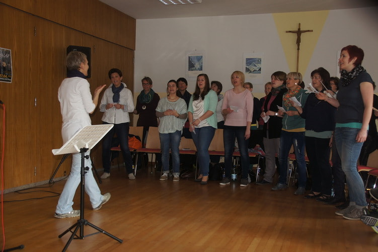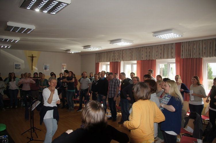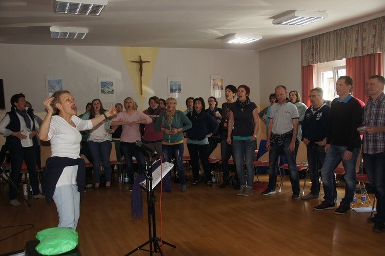 In humorvoller und professioneller Weise lernte uns Angelika Rehaag Schritt für Schritt die Gospelstücke ein – ohne Noten, denn so konnten wir noch viel freier singen. Von den verschiedensten Einsingübungen bis hin zu zahlreichen Singtechniken leitete sie uns durch das Wochenende und schaffte es, den gesamten Chor mit ihrer Energie anzustecken.