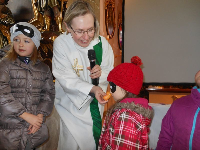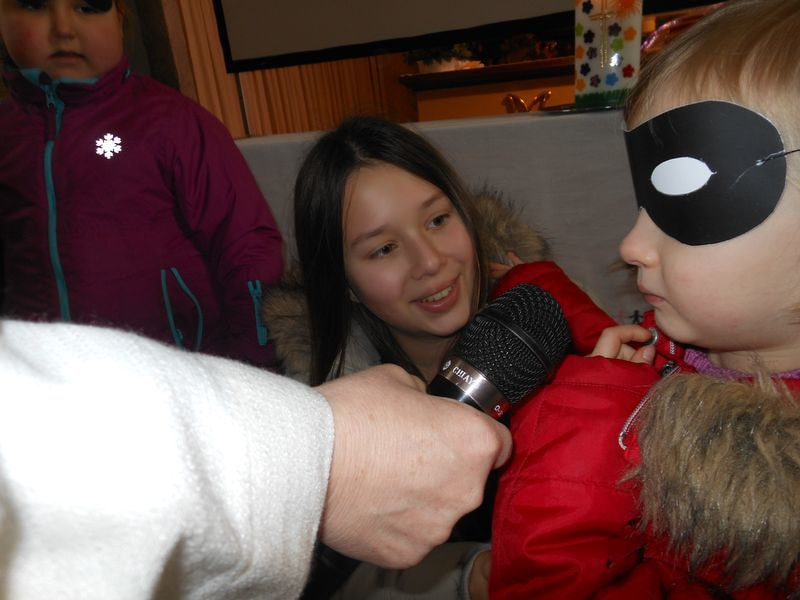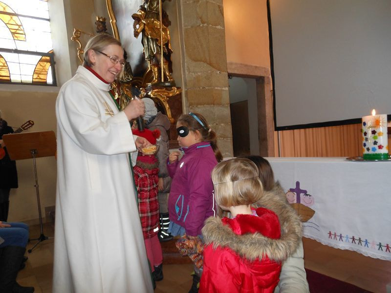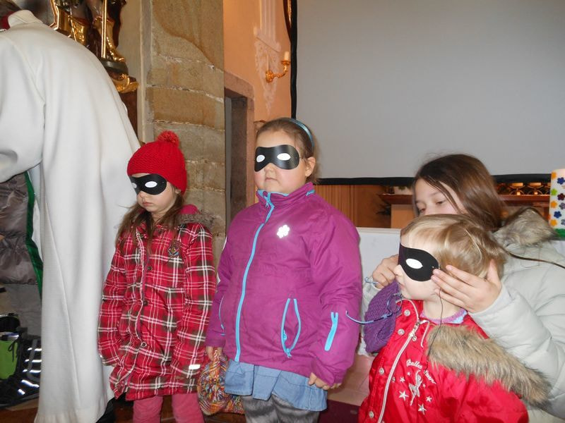Zuerst waren die Kinder eingeladen zu erahnen, wie es ist, blind zu sein. Dazu durften sie mit verbundenen Augen Dinge ertasten, erriechen und schmecken. Auch Geräusche mussten erraten werden. Dann wurde mithilfe von Bildern die Geschichte des blinden Bartimäus gelesen und besprochen. Als kleine Erinnerung bekamen die Kinder eine Maske, die sie für den Fasching weiter verwenden können.