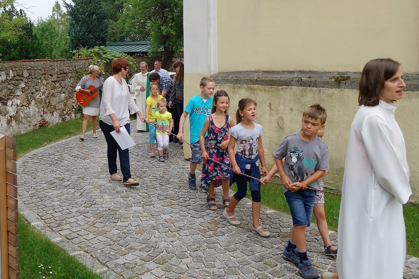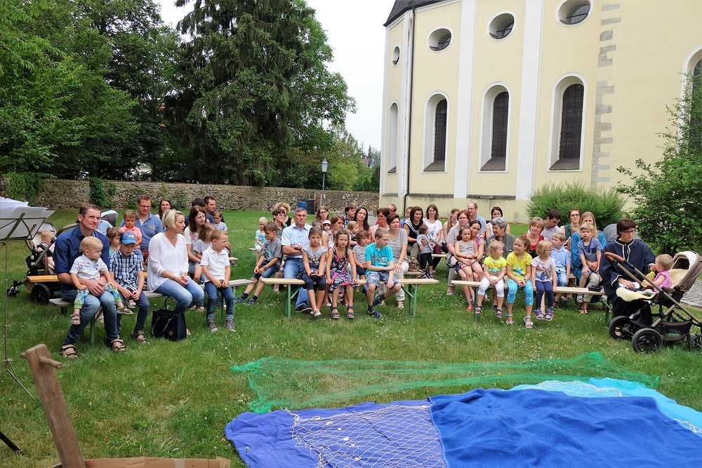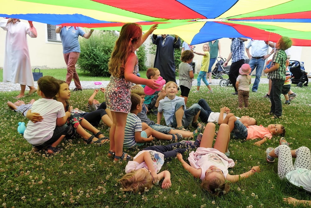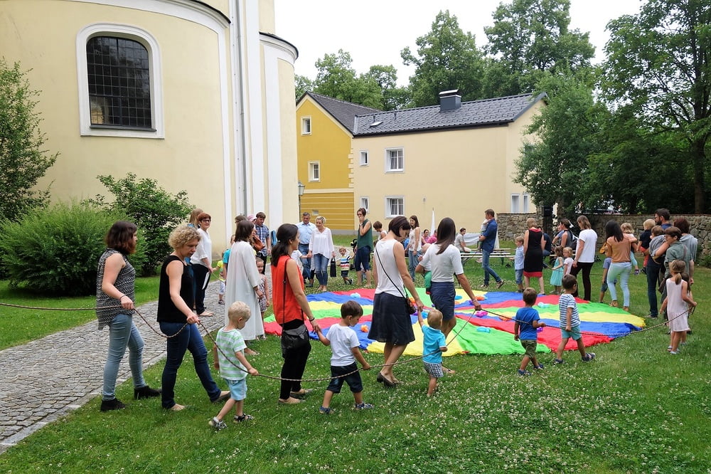 Auch uns lädt Jesus immer wieder neu ein, seine Freunde zu sein. Zum Liedruf „Jesus lädt die Kinder, Mama’s, Papa’s ein, wollt ihr meine Freunde sein?“ wurden alle Feiergäste mit einem langen Seil abgeholt und eingeladen, gemeinsam eine Runde um die Kirche zu ziehen. Den „schwungvollen“ Abschluss dieser Kinderkirche genossen wir sehr. Gemeinsam versuchten wir, mit dem Schwungtuch Wellen zu erzeugen und die Fische in Bewegung zu setzen oder ein Zelt zu bauen, unter das die gesamte Kinderkirche schlupfen durfte!