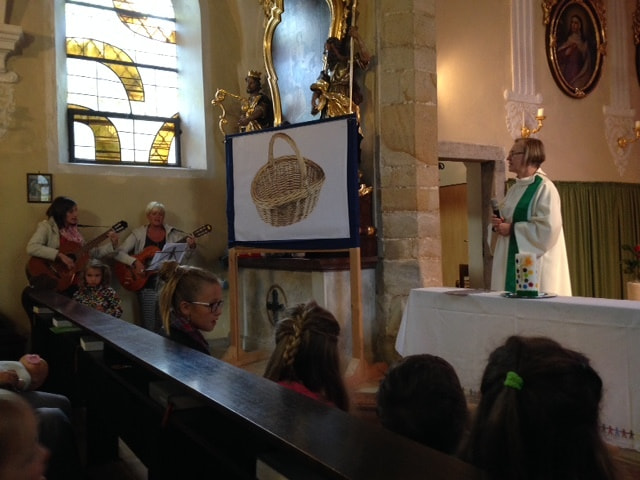 In einem Rollenspiel wurde versucht, den Kindern mitzuteilen, dass es mehr braucht als die menschliche Arbeit, damit die Früchte reifen können. Denn wenn Gott nicht die Körner, die Sonne, den Regen, den Verstand und die Gesundheit geschenkt hätte, dann hätte es keine Ernte gegeben. Zum Abschluss durfte jedes Kind ein ausgeschnittenes Obststück nach vorne bringen und so entstand ein großer Kinderkirche-Obstkorb.