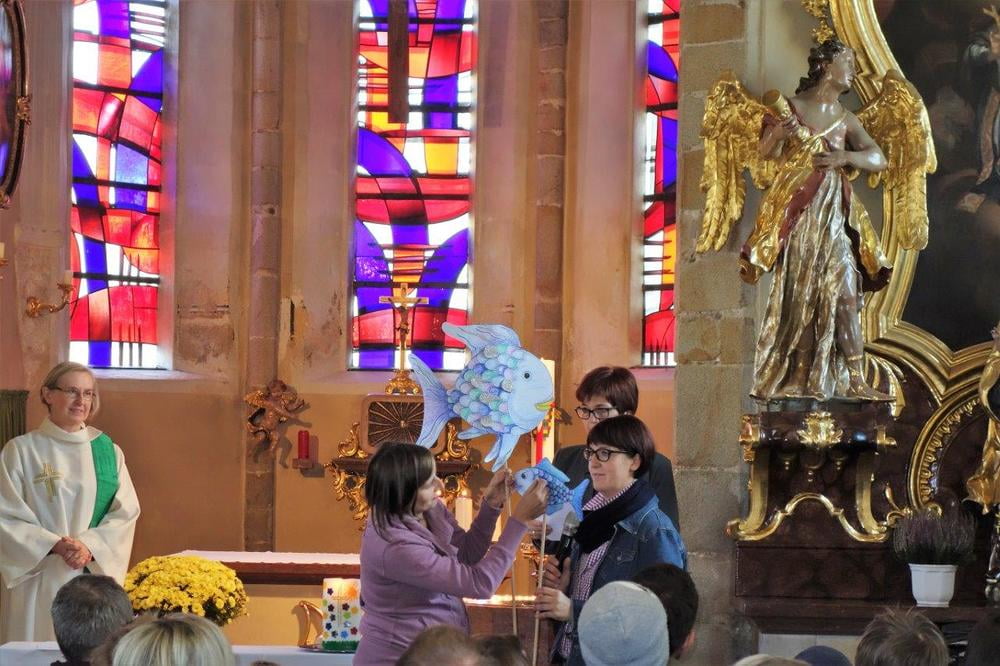 Von einem ganz besonderen Fisch, den Regenbogenfisch, hörten wir im Anschluss: „Der Regenbogenfisch lebt draußen im Meer und fällt besonders durch seine wunderschönen Glitzerschuppen auf. Gerne würden die anderen Fische auch eine Schuppe von ihm haben, doch er lehnt dies ab. Die anderen Fische wendeten sich von ihm ab und er war fortan der einsamste Fisch im Ozean. Erst als der Regenbogenfisch den Oktopus traf, wurde ihm bewusst, dass er durch das Teilen seiner Glitzerschuppen glücklich werden kann. Er überwindet seinen Stolz, verteilte seine Schuppen und war nun der glücklichste Fisch im ganzen Ozean.“ Jedes Kind erhielt nach der Geschichte eine Glitzerschuppe, welche sie auf den eingangs erhaltenen Fisch kleben durften. Die Glitzerschuppe sollte alle daran erinnern, dass Teilen fröhlich macht und Freundschaften entstehen lässt. Der Fisch ist zudem ein Zeichen für die Freundschaft mit Jesus.