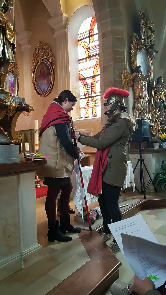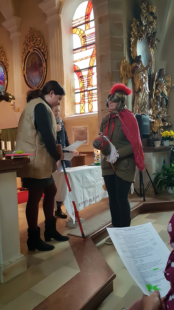 Der Heilige Martin berührt uns sehr durch seine Barmherzigkeit. Wir sahen in dieser Kinderkirche eindrucksvoll die Geschichte vom Heiligen Martin und dem Bettler: „Unser“ Martin ritt durch die Stadt, es war ein kalter Abend im November. Plötzlich sah er am Straßenrand einen Bettler, der fror. Martin zog das Schwert und teilte seinen Mantel mit dem Bettler. Mit frohem Herzen ritt Martin wieder weiter, denn es machte ihn glücklich, einem Menschen geholfen zu haben.“ Nachdem wir die Geschichte gesehen und besprochen hatten, wurden Instrumente an die Kinder ausgeteilt und die Legende des heiligen Martin erneut vorgelesen, diesmal als Klanggeschichte, bei der alle Kinder mitmachen durften. Im Anschluss wurden die Kinder eingeladen, sich ein selbstgebackenes Martinsgebäck zu holen und es auch zu teilen. Wir erklärten den Kindern, dass wir durch das Teilen für jemand anderen ein Licht sein können. Die Laternen, die die Kinder bei den Martinsumzügen in den kommenden Tagen durch die Straßen tragen erinnern uns daran, dass jeder von uns Licht in die Welt bringen kann. Das Licht macht unsere Welt wärmer, wärmer so wie es auch der heilige Martin gemacht hat indem er geteilt hat.