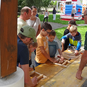 Väter und Mütter mit ihren Kindern haben gemeinsam ein Boot gebastelt, ihre Treffsicherheit bzw. Tastsinn ausprobiert und ihre Konzentration beim Supermikado getestet.