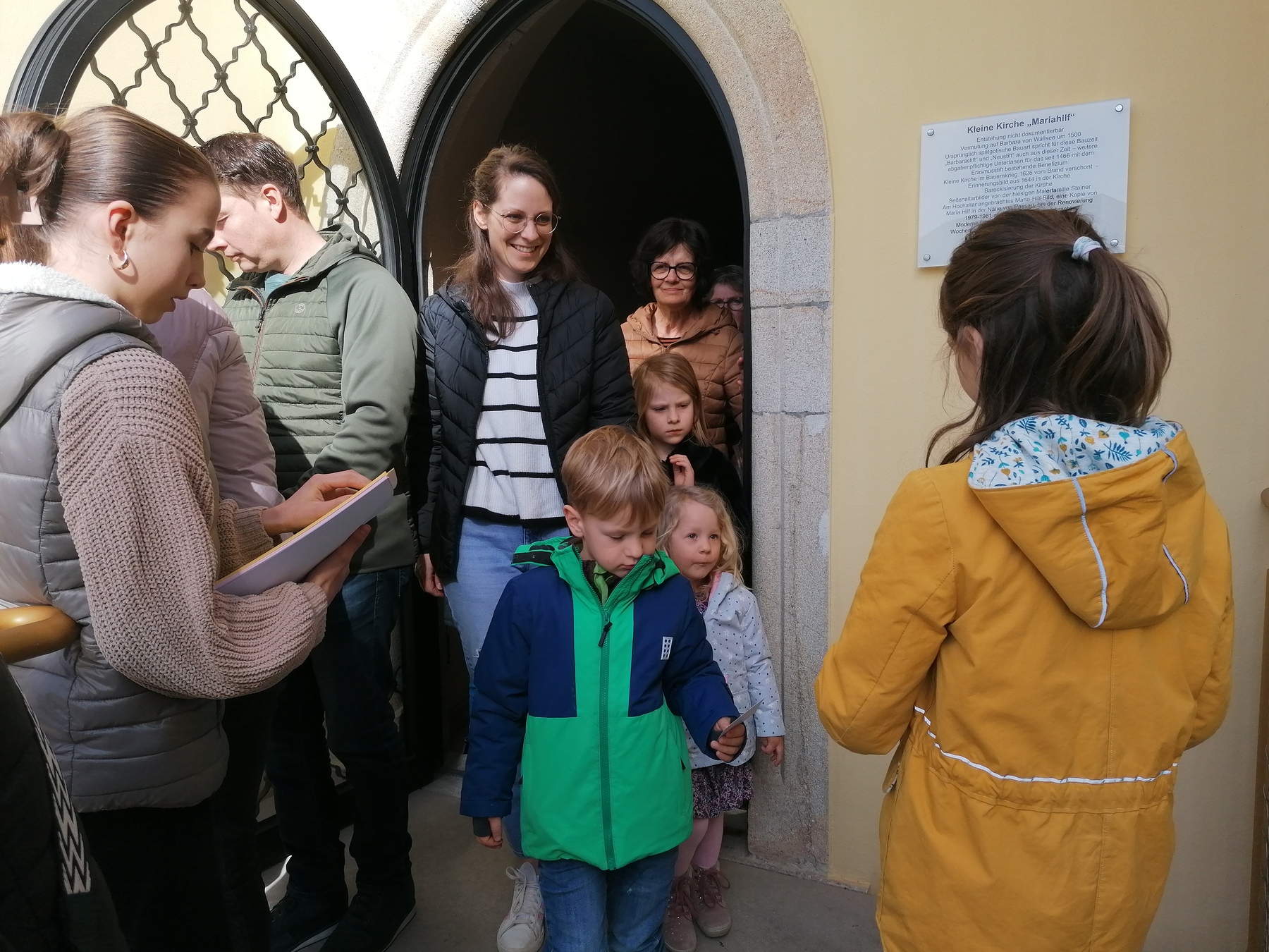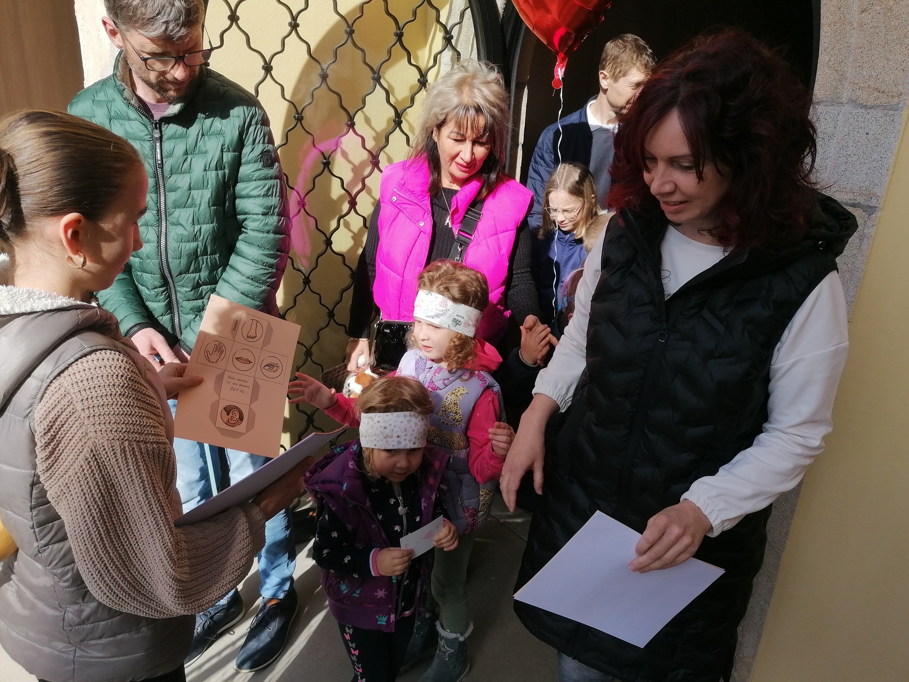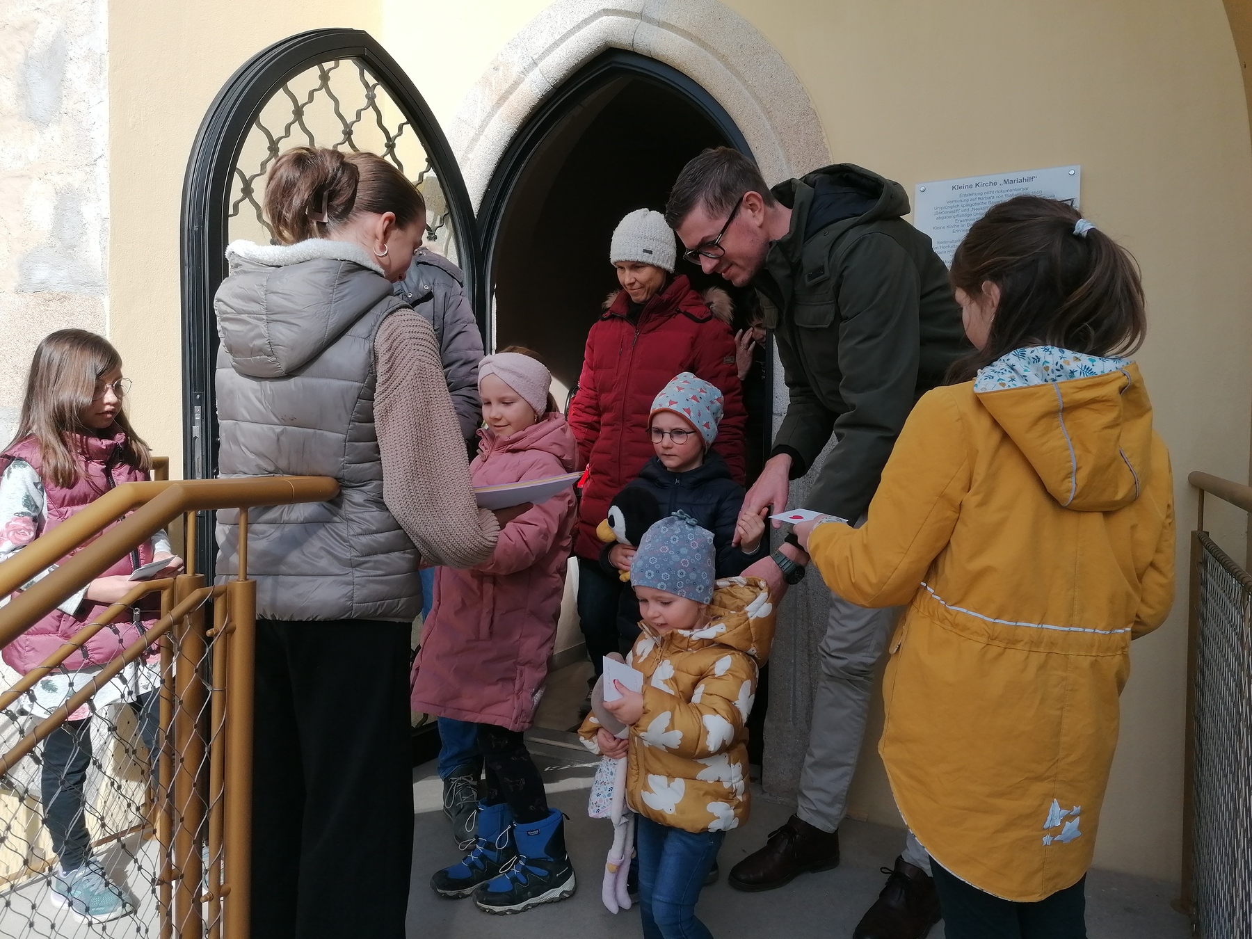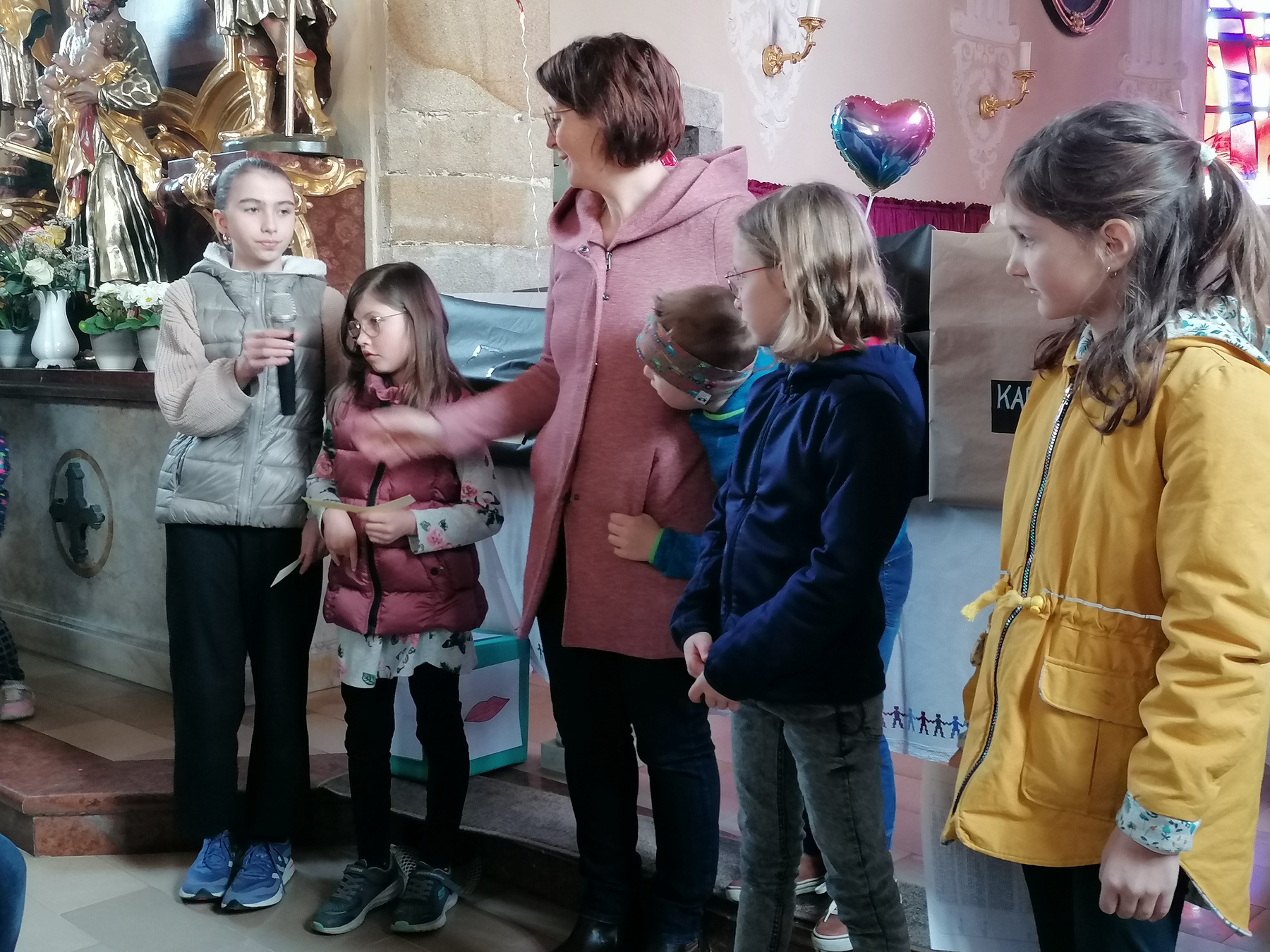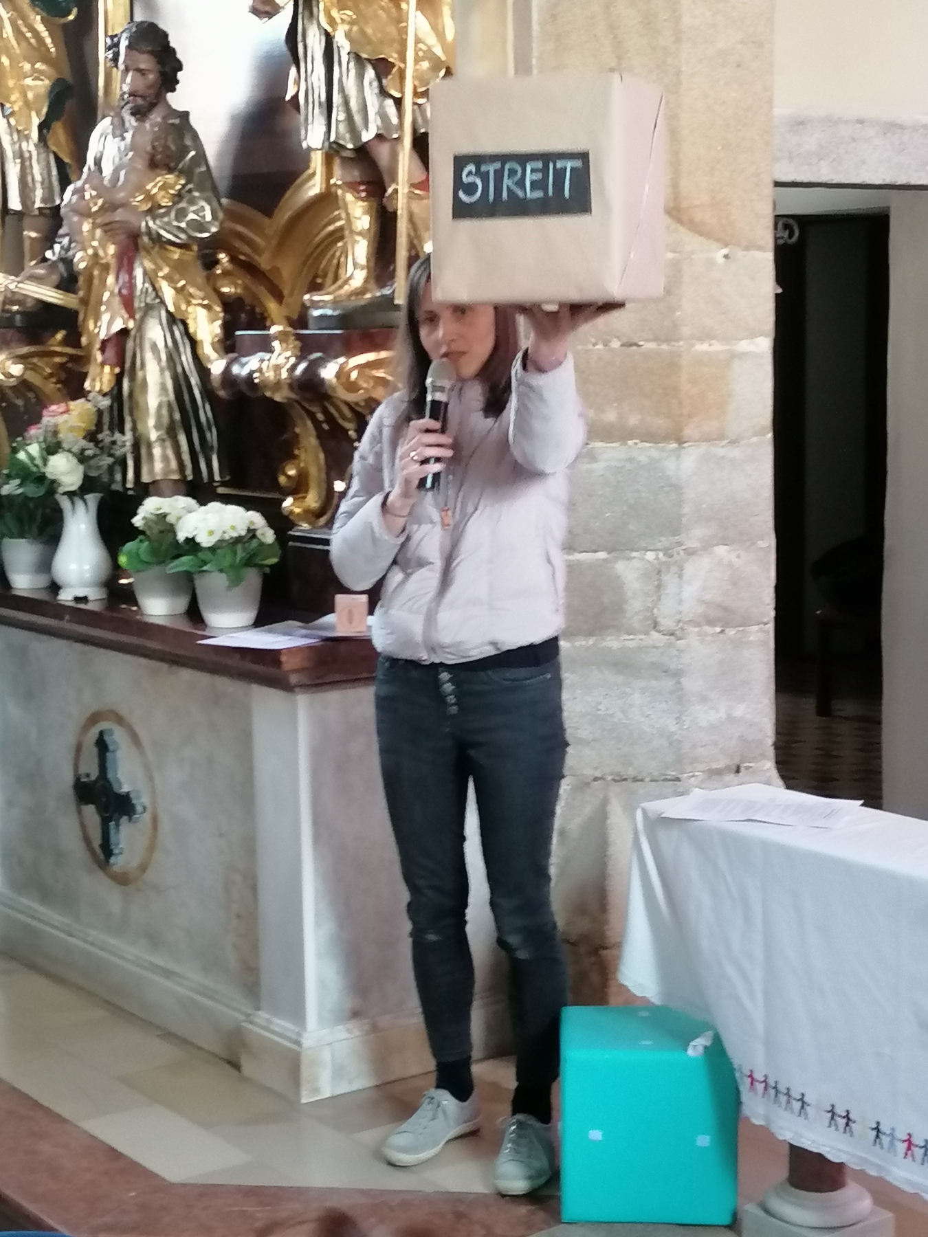 Vier schwere Pakete stehen auch beim Eingang die die Kinder nacheinander nach vor bringen dürfen. Auf jedem Paket steht etwas:
