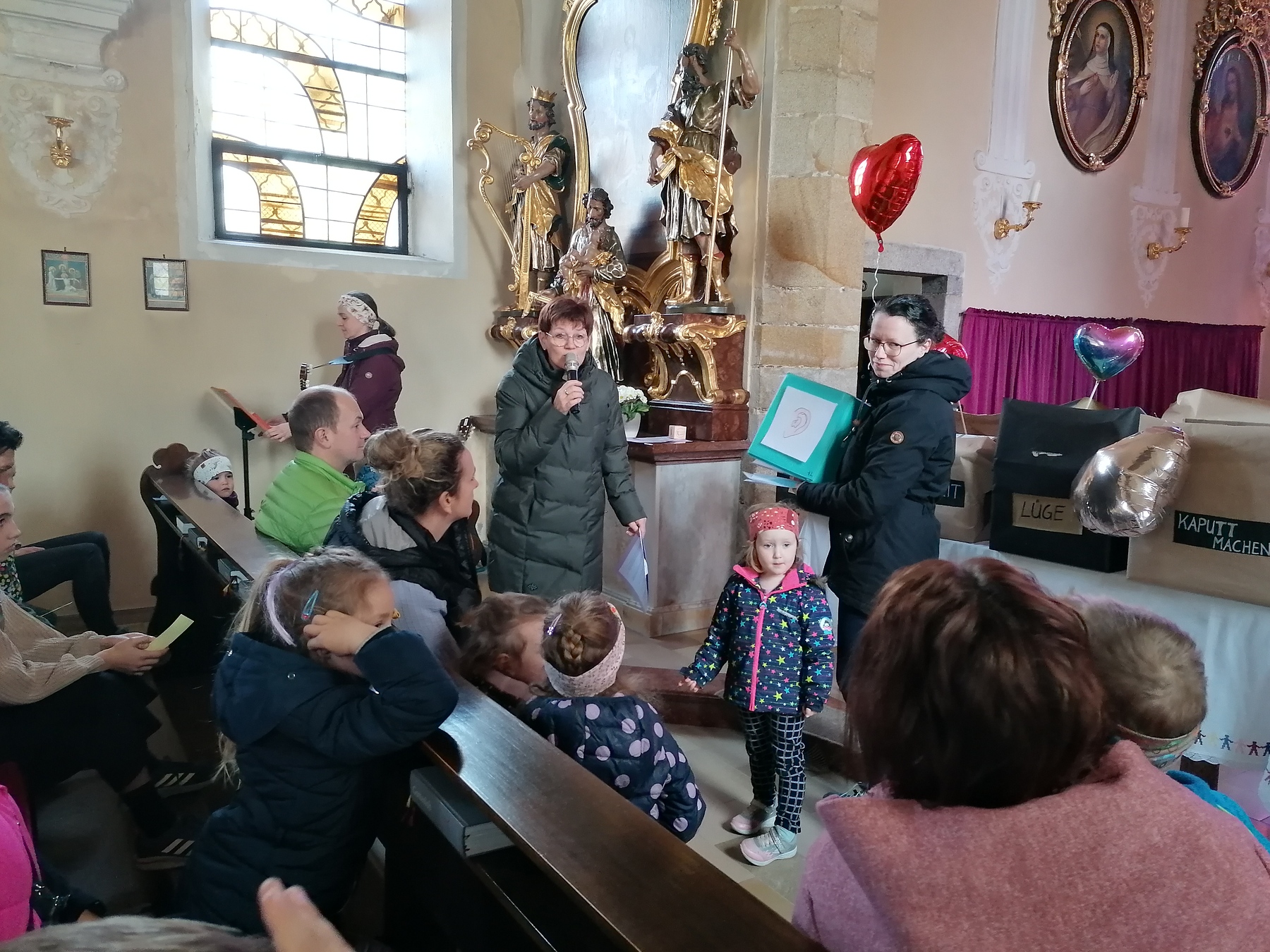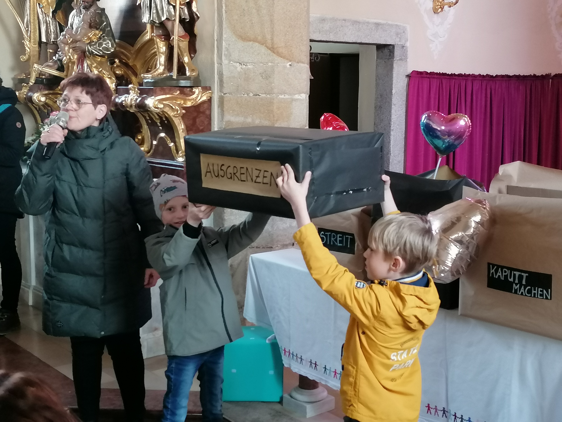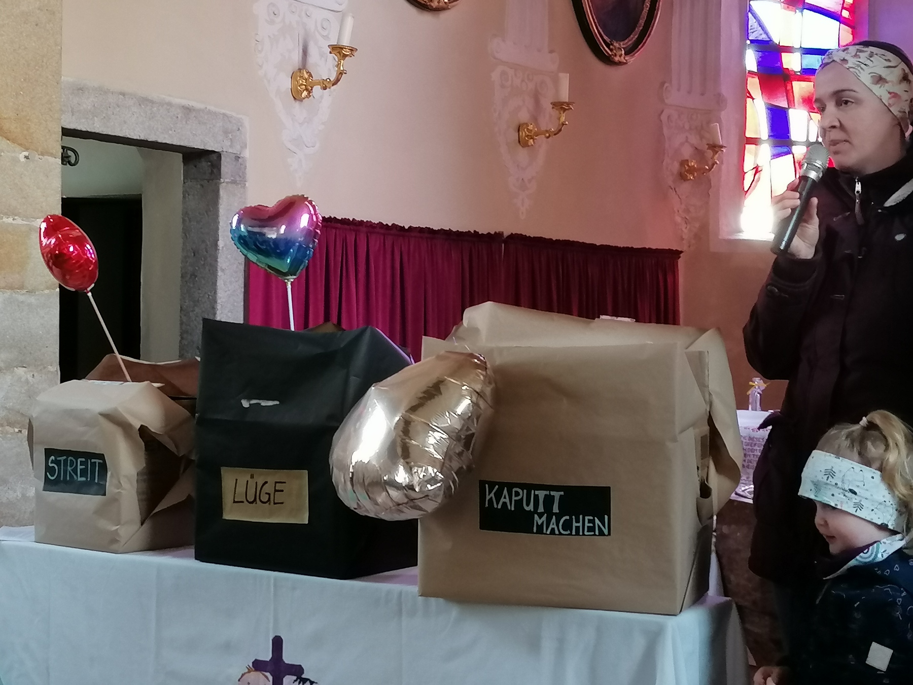 Als Zeichen der Leichtigkeit wird aus jedem Paket ein Herzluftballon ausgepackt und das Lied „Wenn es leichter wir im Herzen danke Gott“ gesungen.